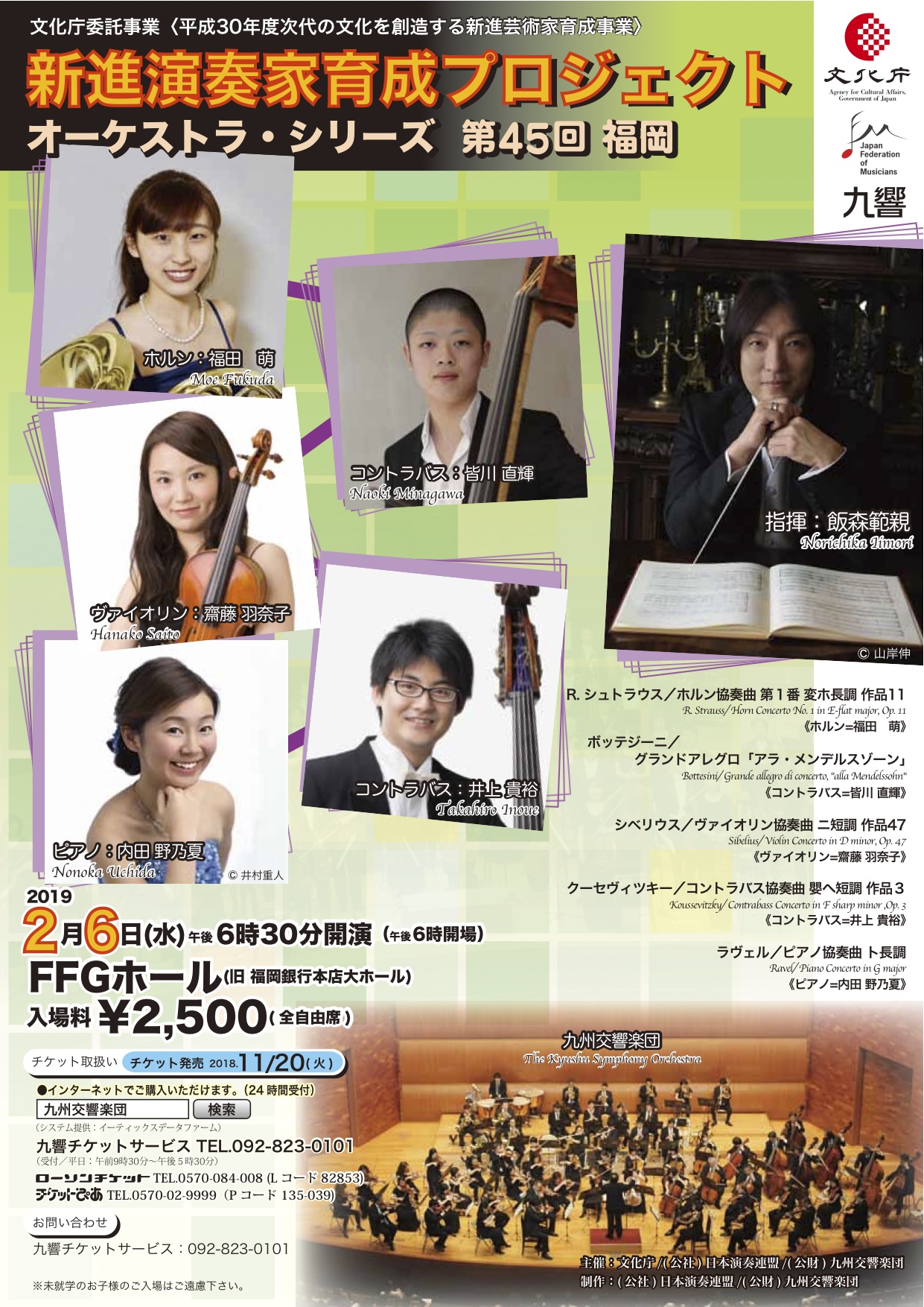 R.シュトラウス/ホルン協奏曲 第1番 変ホ長調 作品11(ホルン:福田 萌) ボッテジーニ/グランドアレグロ「アラ・メンデルスゾーン」(コントラバス:皆川直輝) シベリウス/ヴァイオリン協奏曲 ニ短調 作品47(ヴァイオリン:齋藤羽奈子) クーセヴィツキー/コントラバス協奏曲 嬰ヘ短調 作品3(コントラバス:井上貴裕) ラヴェル/ピアノ協奏曲 ト長調(ピアノ:内田野乃夏) |