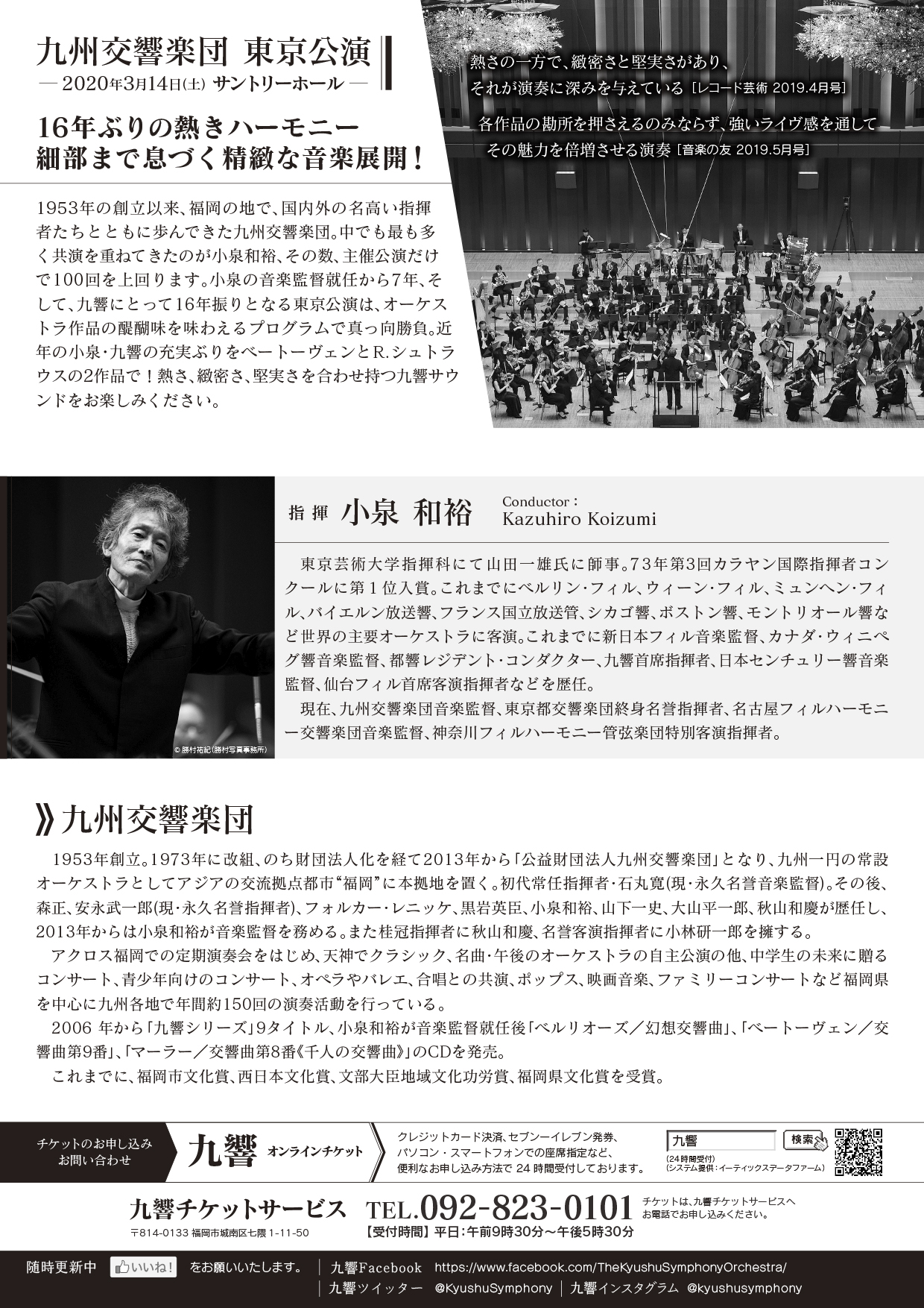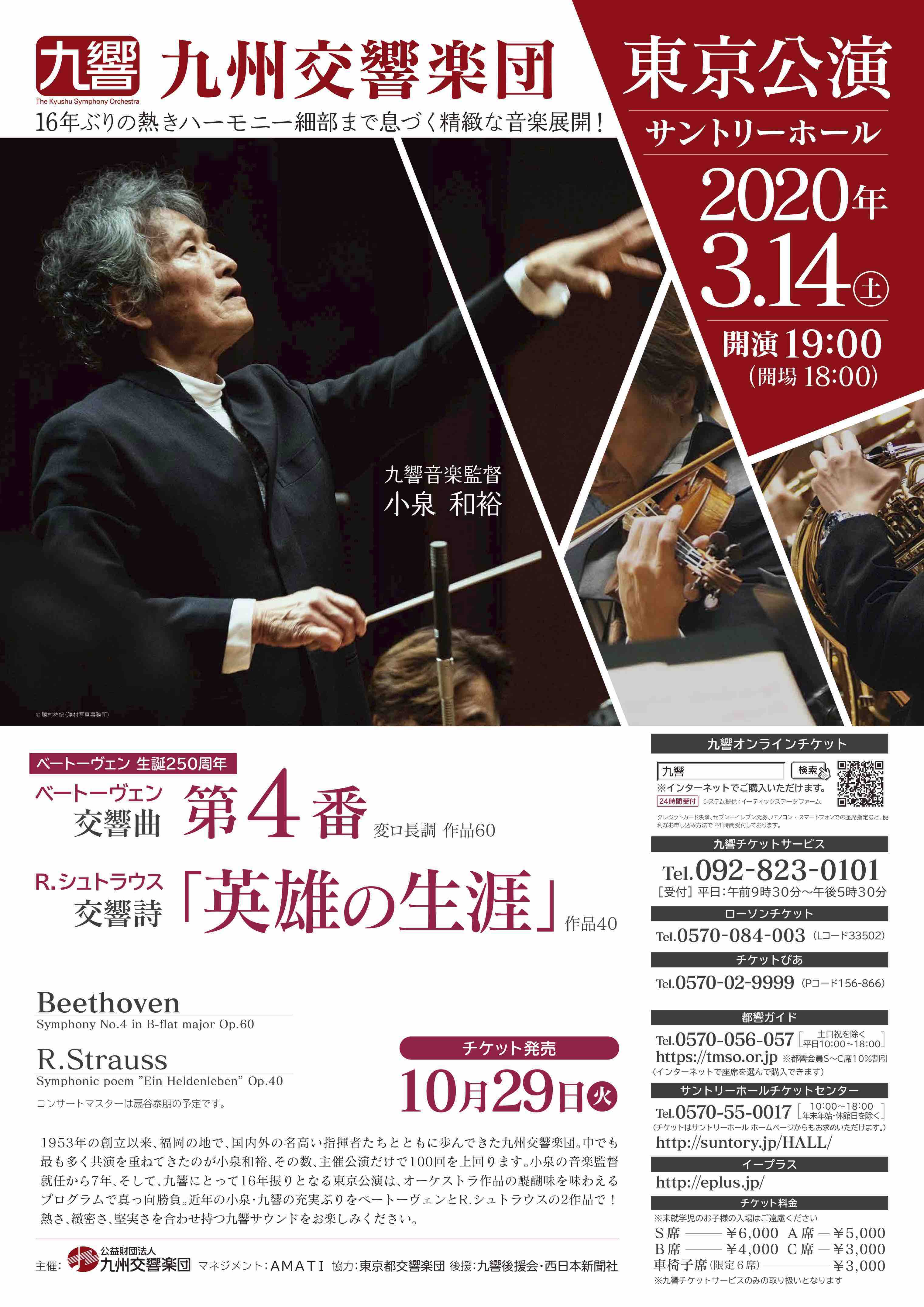 チケット料金 S席:¥6,000 A席:¥5,000 B席:¥4,000 C席:¥3,000 車椅子席:¥3,000(限定6席) ※車椅子席は、九響チケットサービス(Tel:092-823-0101)のみの取り扱いとなります。 ※上記のチケット料金は、税込の価格です。