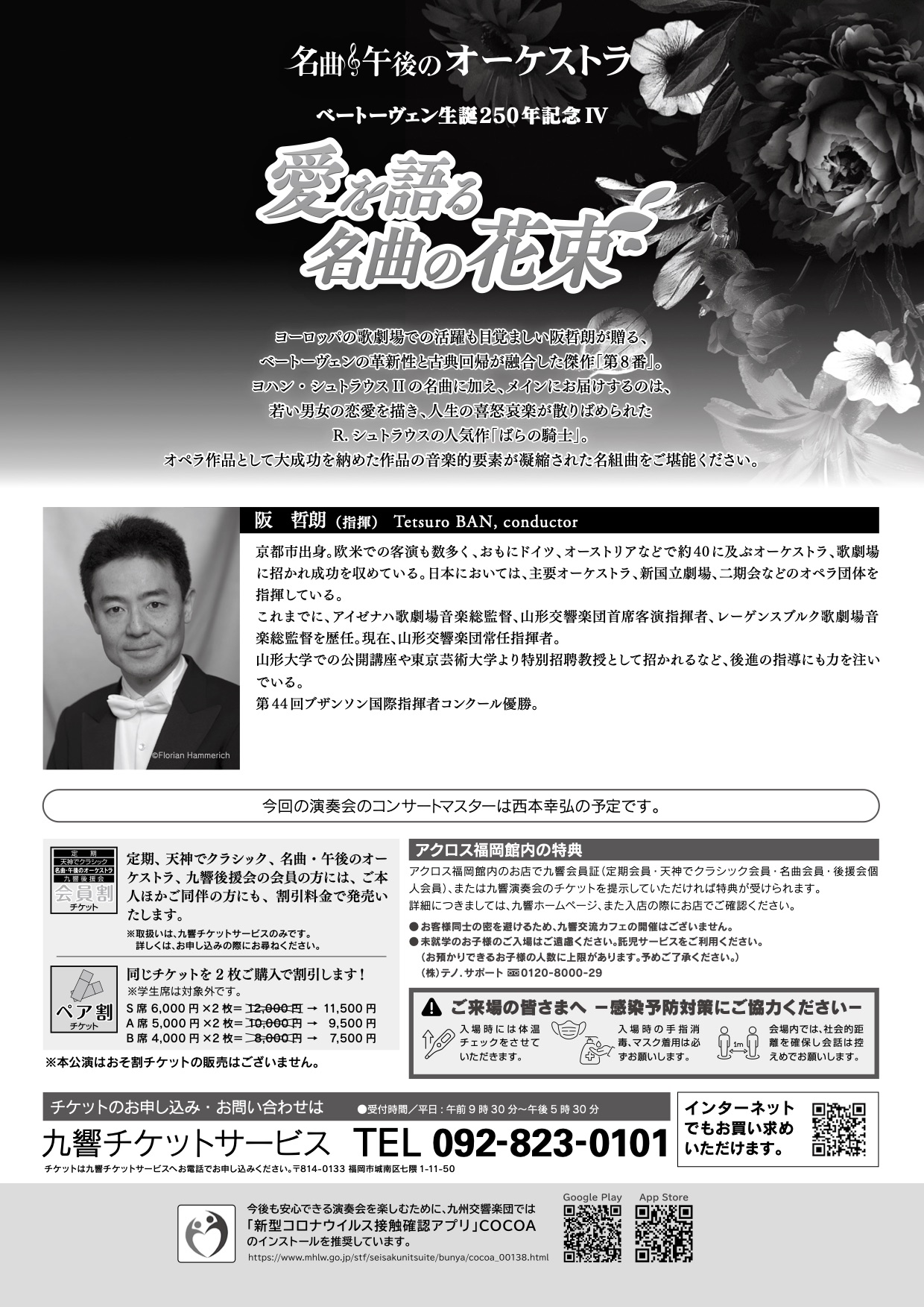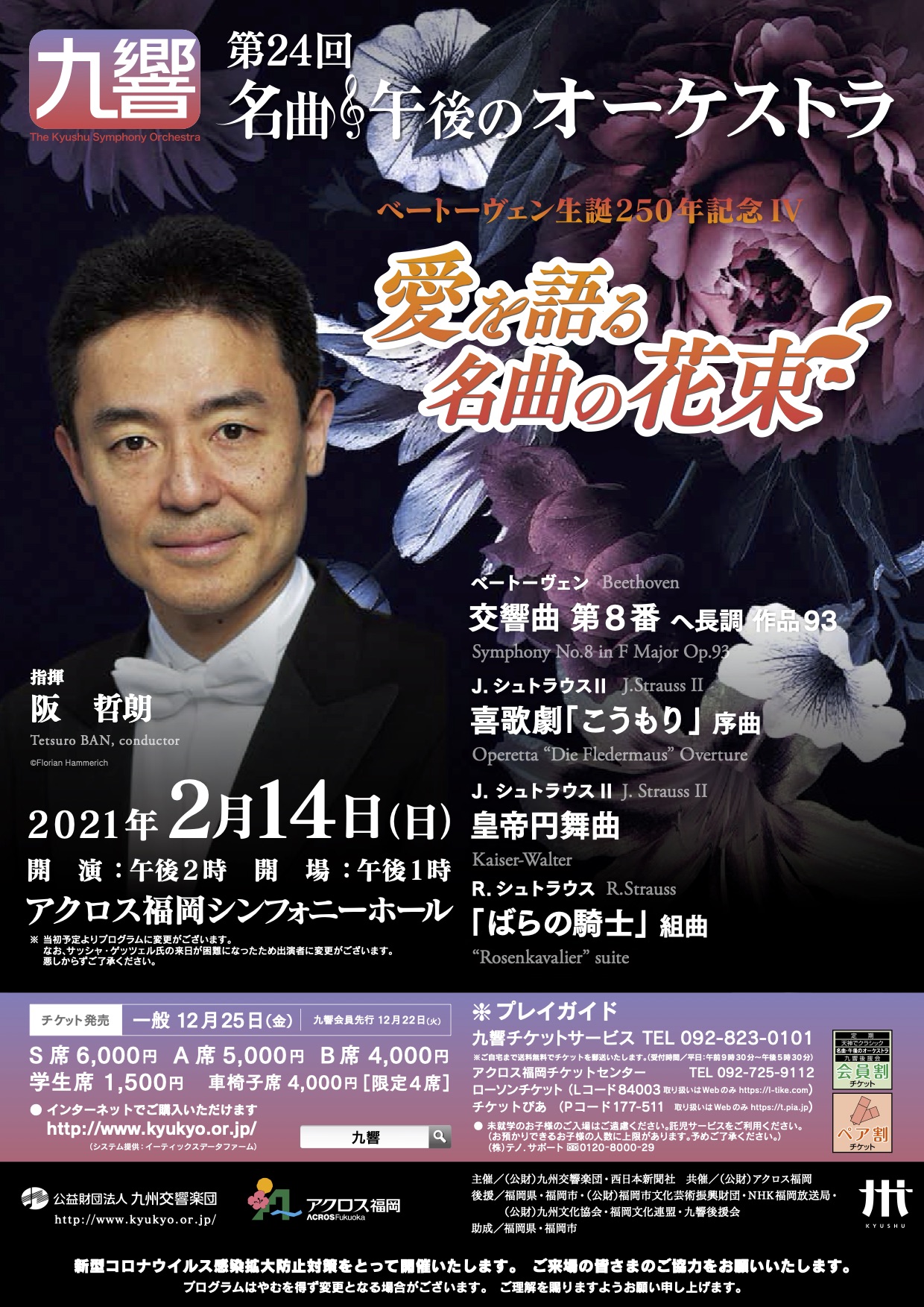ベートーヴェン/交響曲 第8番 ヘ長調 作品93 J.シュトラウスⅡ/喜歌劇「こうもり」序曲 J.シュトラウスⅡ/皇帝円舞曲 R.シュトラウス/「ばらの騎士」組曲 ※当初の予定より曲目の変更がございます。 ※第24回 名曲・午後のオーケストラ 指揮者の変更について |