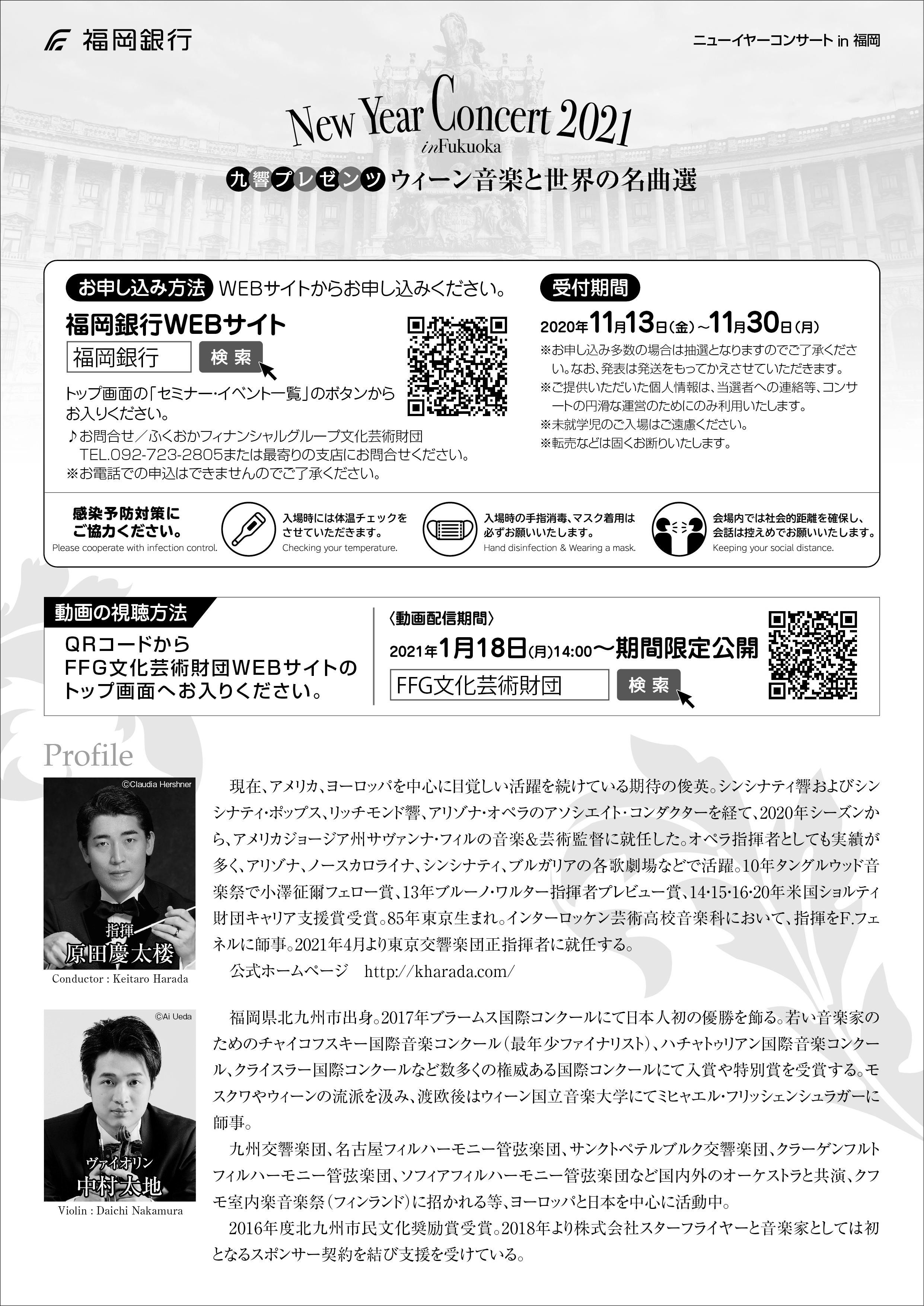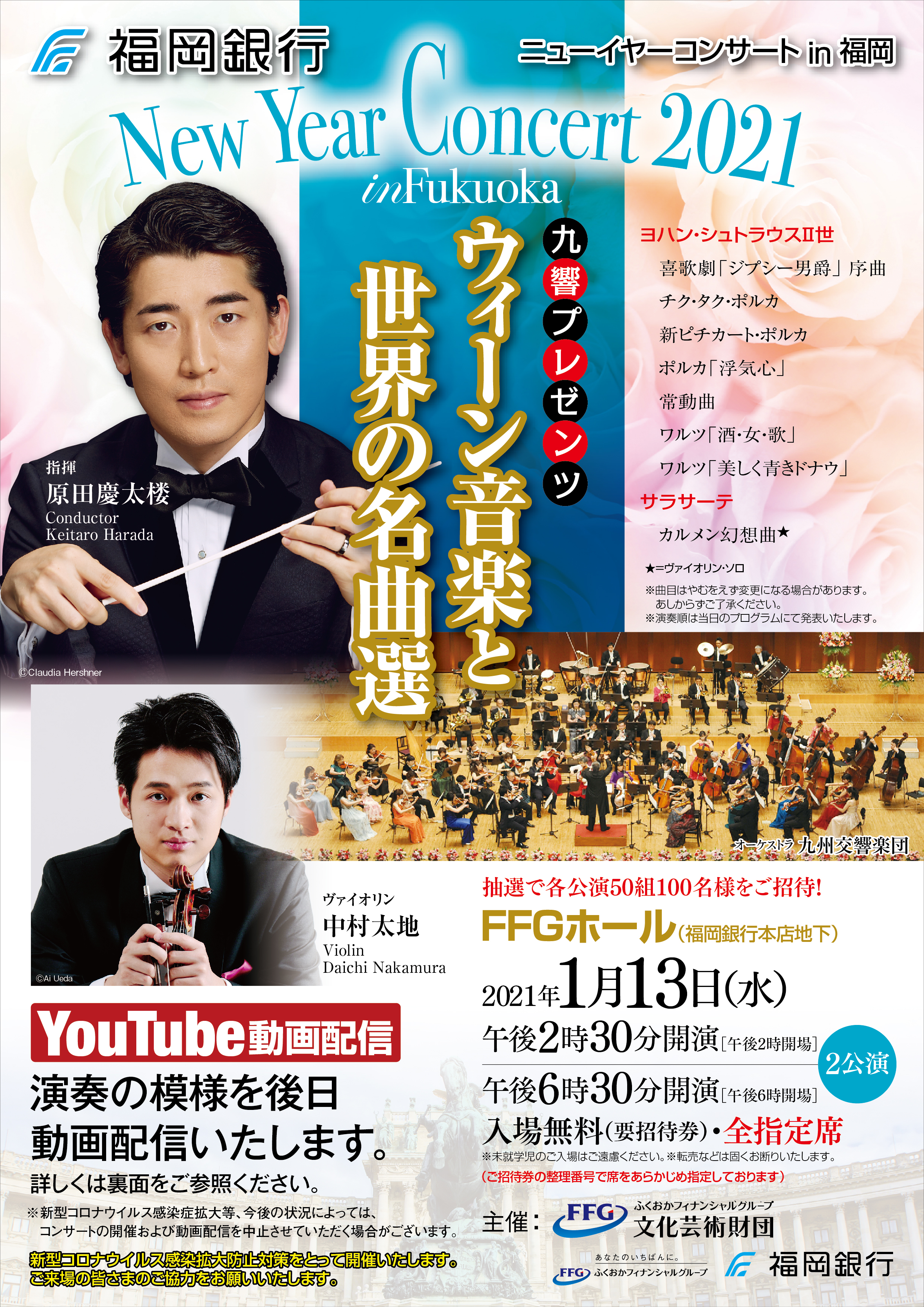 ヨハン・シュトラウスⅡ/喜歌劇「ジプシー男爵」序曲 ヨハン・シュトラウスⅡ/チク・タク・ポルカ ヨハン・シュトラウスⅡ/新ピチカート・ポルカ ヨハン・シュトラウスⅡ/ポルカ「浮気心」 ヨハン・シュトラウスⅡ/常動曲 ヨハン・シュトラウスⅡ/ワルツ「酒・女・歌」 ヨハン・シュトラウスⅡ/ワルツ「美しく青きドナウ」 サラサーテ/カルメン幻想曲 ※演奏順は当日のプログラムにて発表させていただきます。 ◎YouTube動画配信 無観客での演奏収録を別日程で行い、配信を予定しております。 [動画配信期間]2021年1月18日(月) (詳しくはFFG文化芸術財団WEBサイトをご覧ください) https://www.fukuoka-fg.com/csr/foundation/ |