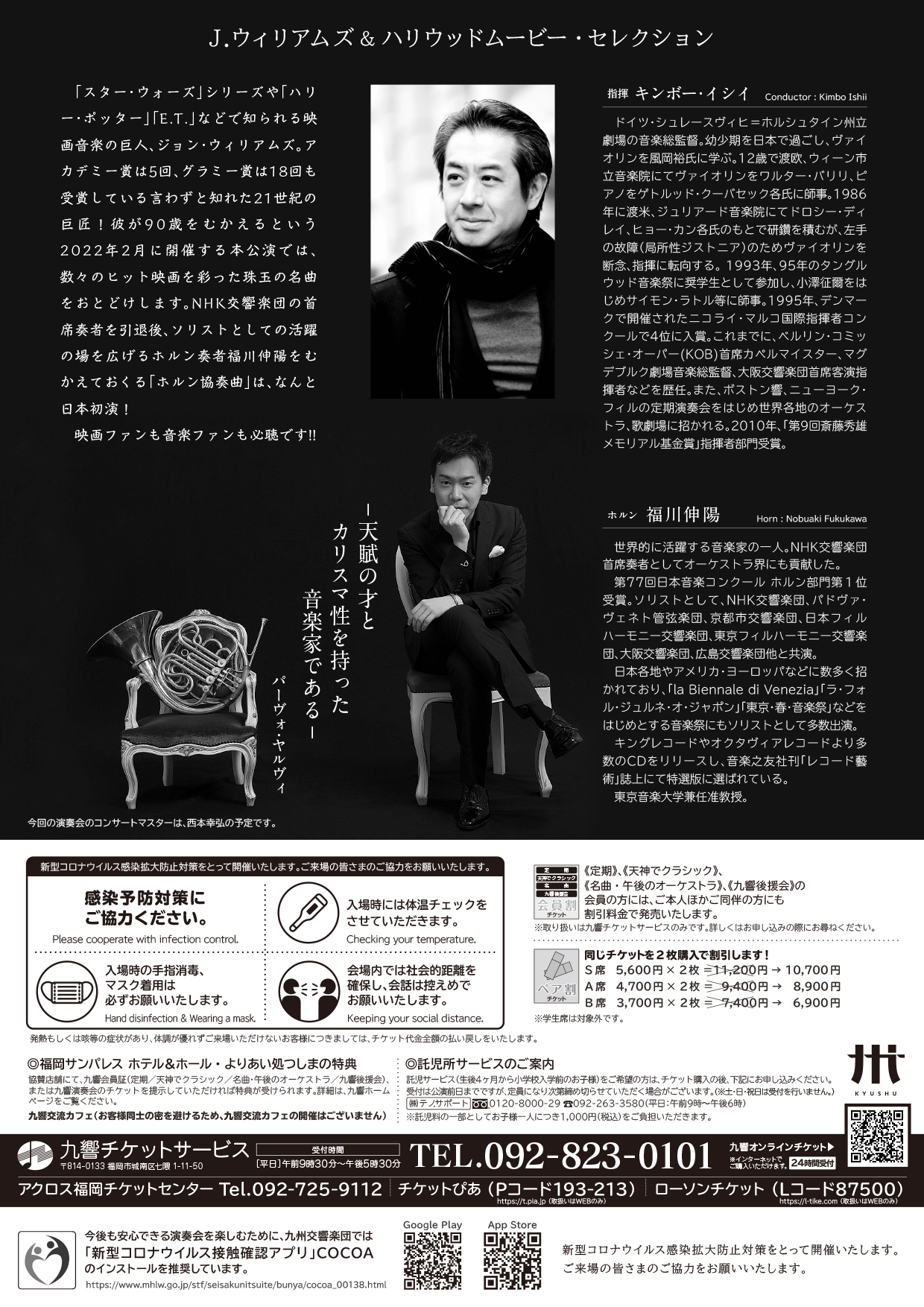 ジョン・ウィリアムズ/ オリンピック・ファンファーレ&テーマ 映画「ジョーズ」テーマ 映画「ジュラシックパーク」テーマ 映画「インディ・ジョーンズ」より レイダース・マーチ 映画「シンドラーのリスト」テーマ ホルン協奏曲 ※日本初演 バーンスタイン(J.メイソン編)/ 「ウエスト・サイド・ストーリー」セレクション ジョン・ウィリアムズ/ 映画「スーパーマン」よりマーチ 映画「ハリー・ポッターと賢者の石」より ヘドウィッグのテーマ 映画「E.T.」より フライング・テーマ 映画「スター・ウォーズ」より 帝国のマーチ・メインタイトル ※当初の予定より出演者が変更になりました ※公演開催時のチェックリストはこちら。 |