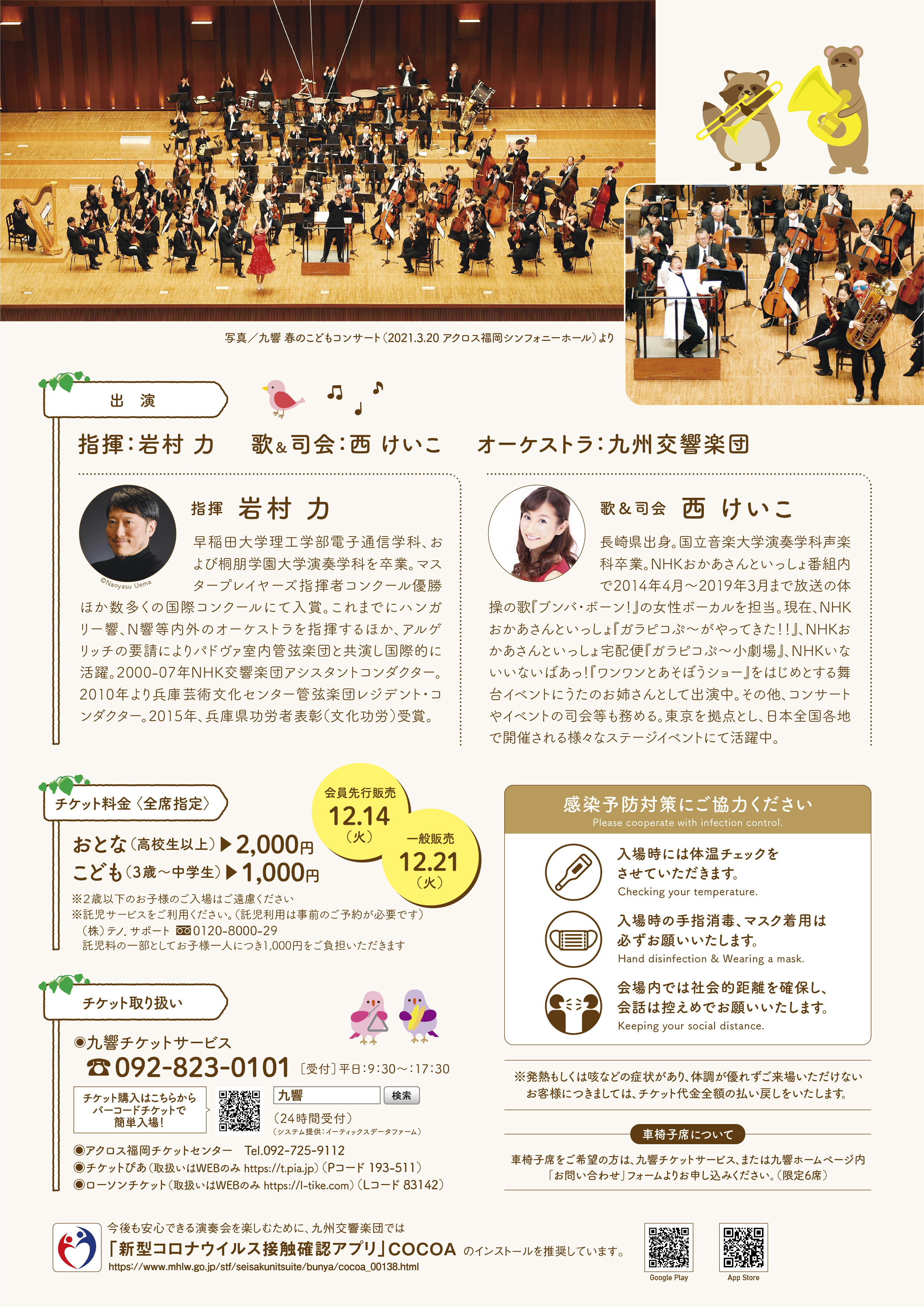 ネッケ/クシコスポスト 【楽器紹介】山本和彦(編)/フォークダンスメドレー 【会場参加】「紅蓮華」「炎」(鬼滅の刃より)、おもちゃのチャチャチャ、ふるさと/嵐 ドヴォルザーク/スラブ舞曲第1番 チャイコフスキー/「弦楽セレナーデ」より第1楽章 ムソルグスキー(ラヴェル編曲)/組曲「 展覧会の絵 」より バーバヤーガの小屋、キエフの大門 ※イベント開催時のチェックリストはこちら。 ※本公演は当日券を販売いたします。詳しくはこちらをご覧ください。 |
