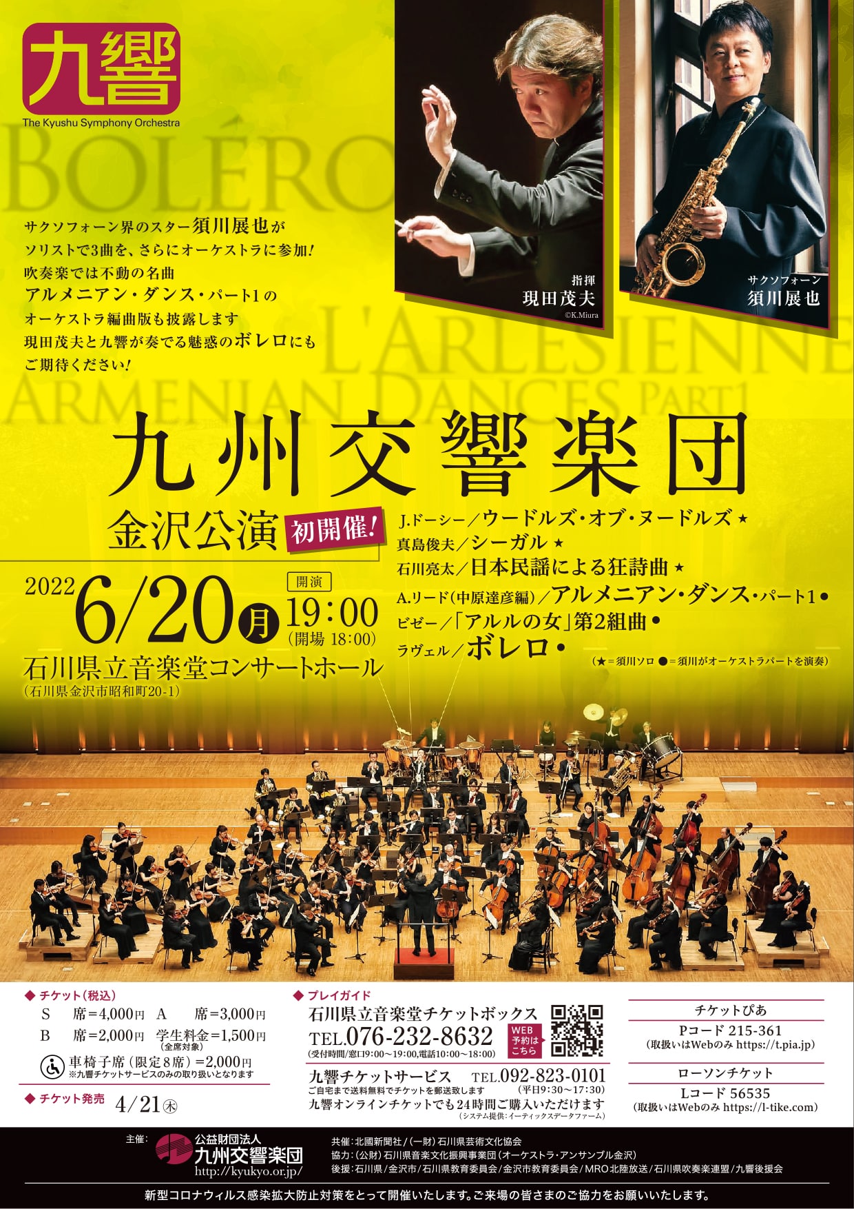 J.ドーシー/ウードルズ・オブ・ヌードルズ★ 真島俊夫/シーガル★ 石川亮太/日本民謡による狂詩曲★ A.リード(中原達彦編)/アルメニアン・ダンス・パート1● ビゼー/「アルルの女」第2組曲● ラヴェル/ボレロ● (★=須川ソロ ●=須川がオーケストラパートを演奏) ※イベント開催時のチェックリストはこちら ※本公演は、文化芸術振興費補助金 統括団体によるアートキャラバン事業(コロナ禍からの文化芸術活動の再興支援事業)に採択されました。つきましては、催事名を「オーケストラ・キャラバン 九州交響楽団 金沢公演」に変更して開催いたします。(2022/5/23更新) |