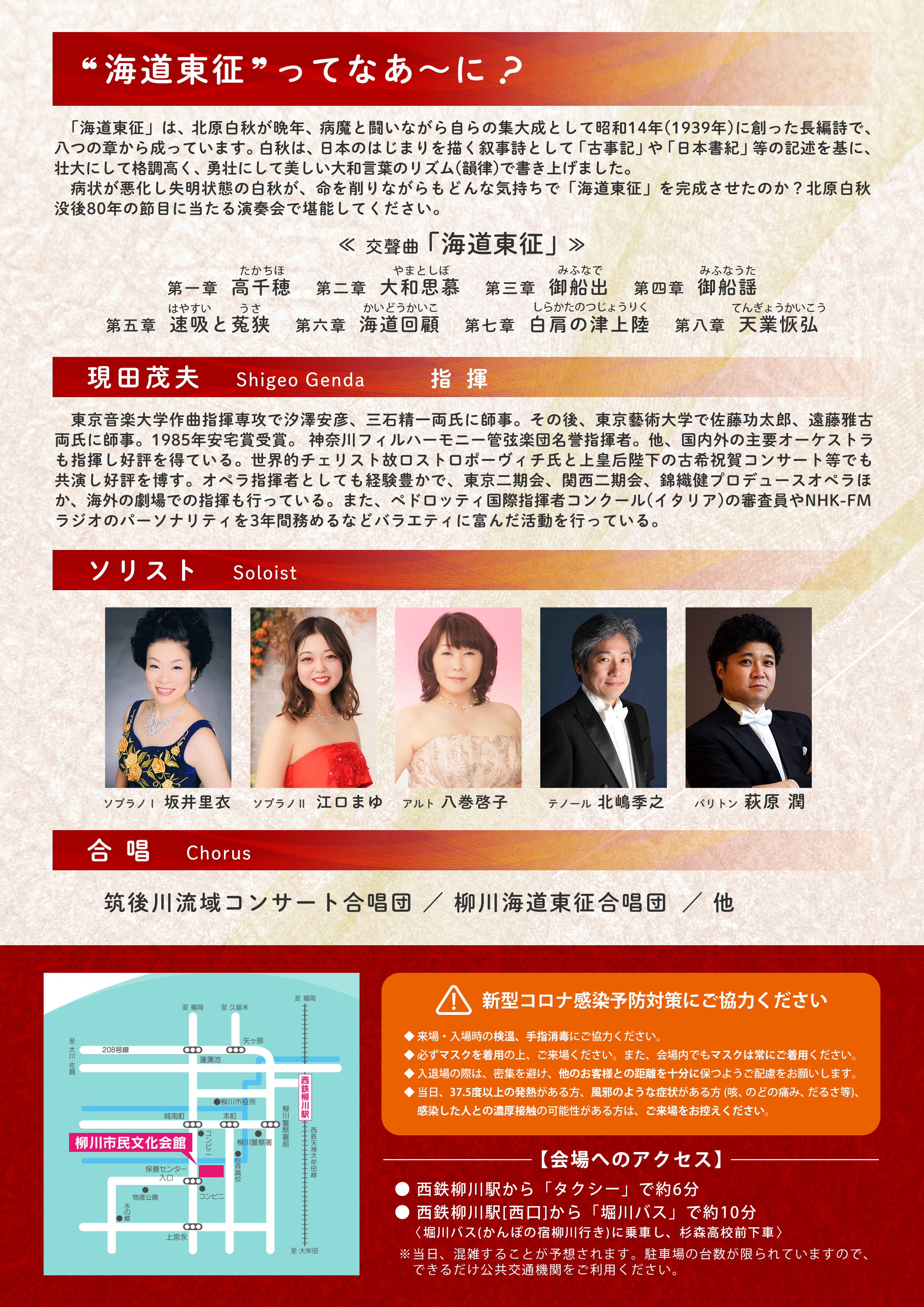 ソプラノ 坂井里衣 ソプラノ 江口まゆ アルト 八巻啓子 テノール 北嶋季之 バリトン 萩原 潤 合唱 筑後川流域コンサート合唱団, 柳川海道東征合唱団, 柳川少年少女合唱団 |