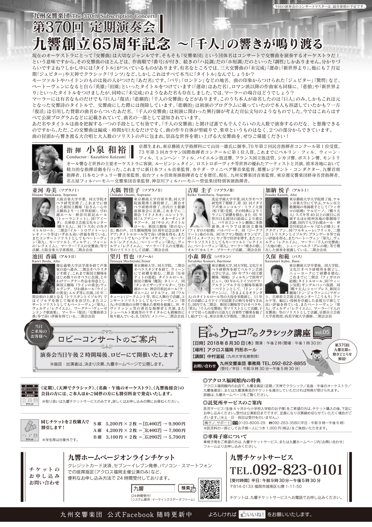 ソプラノ 並河寿美 ソプラノ 大隅智佳子 ソプラノ 吉原圭子 アルト 加納悦子 アルト 池田香織 テノール 望月哲也 バリトン 小森輝彦 バス 久保和範 合唱・児童合唱 [合唱]九響合唱団、九州大学男声合唱団コールアカデミー、久留米大学附設高等学校合唱部、多目的混声合唱団”Chor Solfa!”、RKB女声合唱団、福岡県立福岡工業高等学校グリークラブ、ちくしの混声合唱団、合唱団 いろ、西南オラトリオ・アカデミー合唱団、西南学院大学管弦楽団、九大混声合唱団、中村学園大学・短期大学部合同クリスタルハーモニー、声楽アンサンブルPons Show You、合唱団tutti、その他有志 [児童合唱] NHK福岡児童合唱団MIRAI、久留米児童合唱団、筑紫女学園中学校音楽部 |