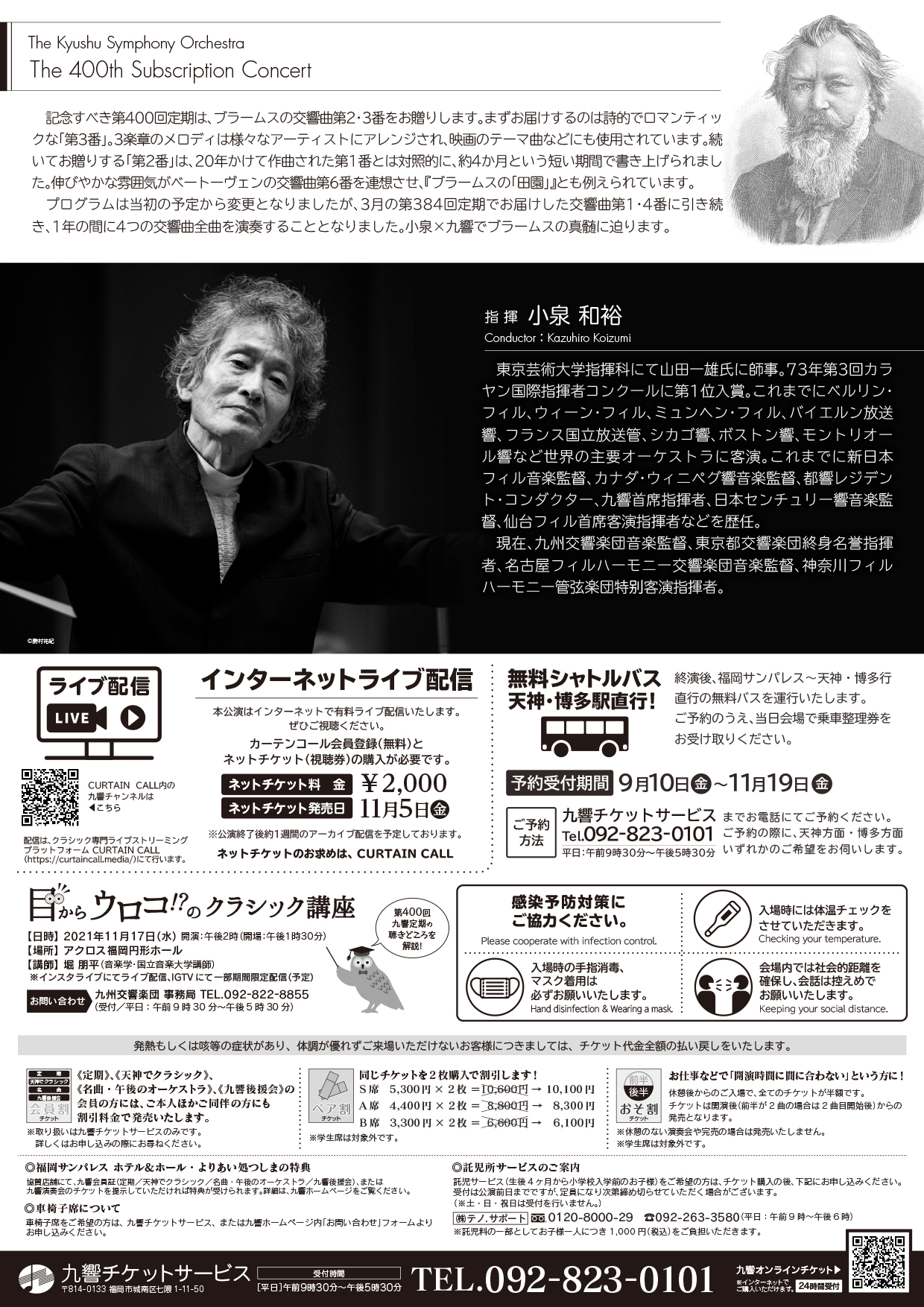 ブラームス/交響曲 第3番 ヘ長調 作品90 ブラームス/交響曲 第2番 ニ長調 作品73 ※当初の予定より曲目が変更になりました ※本公演はライブ配信を行います。ネットチケット(視聴券)のご購入はこちら。(11/5発売) |