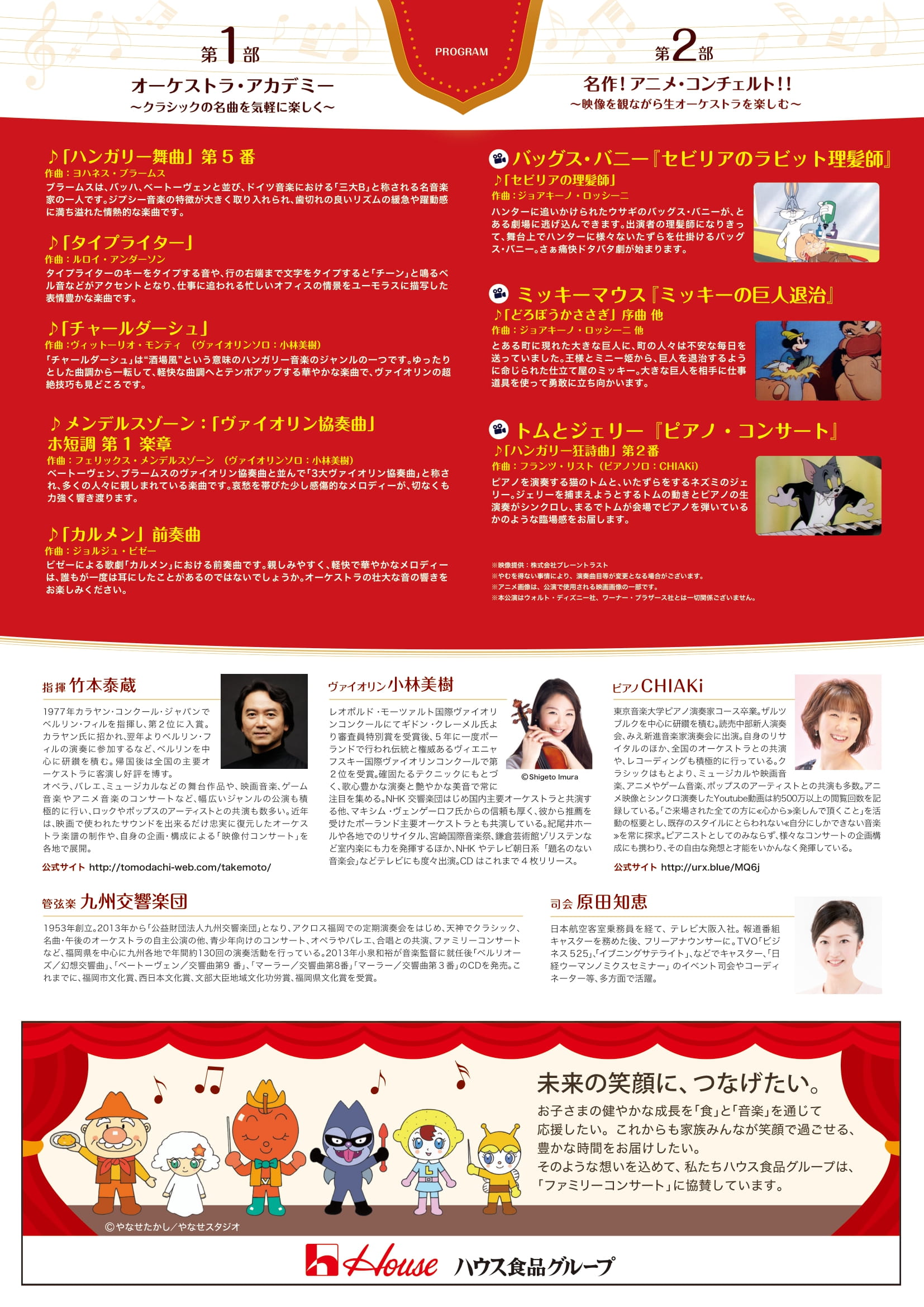 第1部 オーケストラ・アカデミー ~クラシックの名曲を気軽に楽しく~ ヨハネス・ブラームス/「ハンガリー舞曲」第5番 ルロイ・アンダーソン/「タイプライター」 ヴィットーリオ・モンティ/「チャールダーシュ」(ヴァイオリンソロ:小林美樹) フェリックス・メンデルスゾーン/「ヴァイオリン協奏曲」ホ短調 第1楽章 (ヴァイオリンソロ:小林美樹) ジョルジュ・ビゼー/「カルメン」前奏曲 第2部 名作!アニメ・コンチェルト!! ~映像を観ながら生オーケストラを楽しむ~ バッグス・バニー『セビリアのラビット理髪師』 「セビリアの理髪師」/ジョアキーノ・ロッシーニ ミッキーマウス『ミッキーの巨人退治』 「どろぼうかささぎ」序曲 他/ジョアキーノ・ロッシーニ 他 トムとジェリー『ピアノ・コンサート』 「ハンガリー狂詩曲第2番」/フランツ・リスト(ピアノソロ:CHIAKi) ※映像提供:株式会社ブレーントラスト ※本公演はウォルト・ディズニー社、ワーナー・ブラザース社とは一切関係ございません。 詳しくはこちらをご覧ください。 |