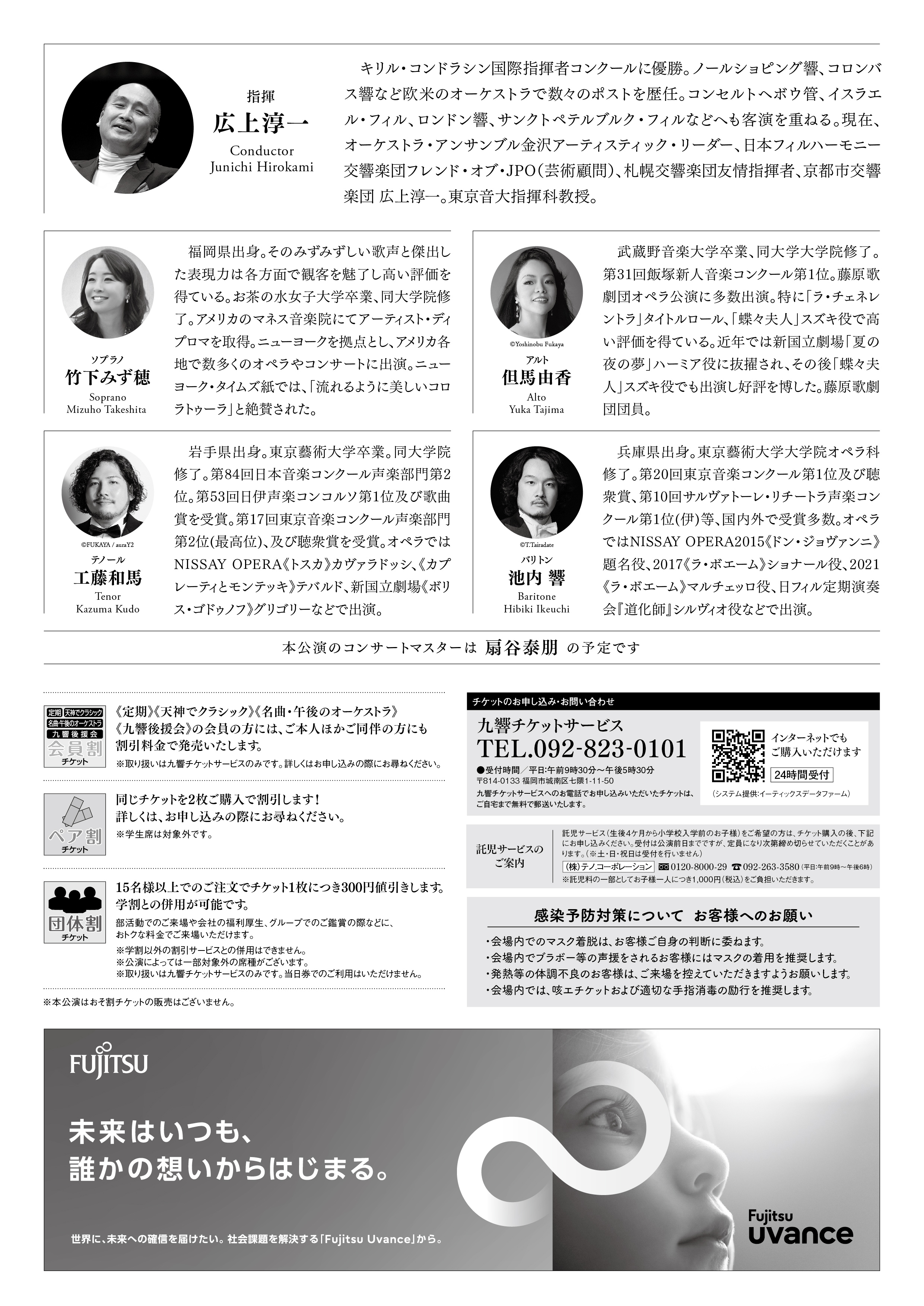 ソプラノ 竹下 みず穂 アルト 但馬 由香 テノール 工藤 和真 バリトン 池内 響 合唱 九響合唱団、 RKB女声合唱団、 九州大学男声合唱団コールアカデミー、 久留米音協合唱団、 声楽アンサンブルPons Show You、 多目的混声合唱団"Chor Solfa!"、 ちくしの混声合唱団、 福岡県立福岡工業高等学校グリークラブ ほか |