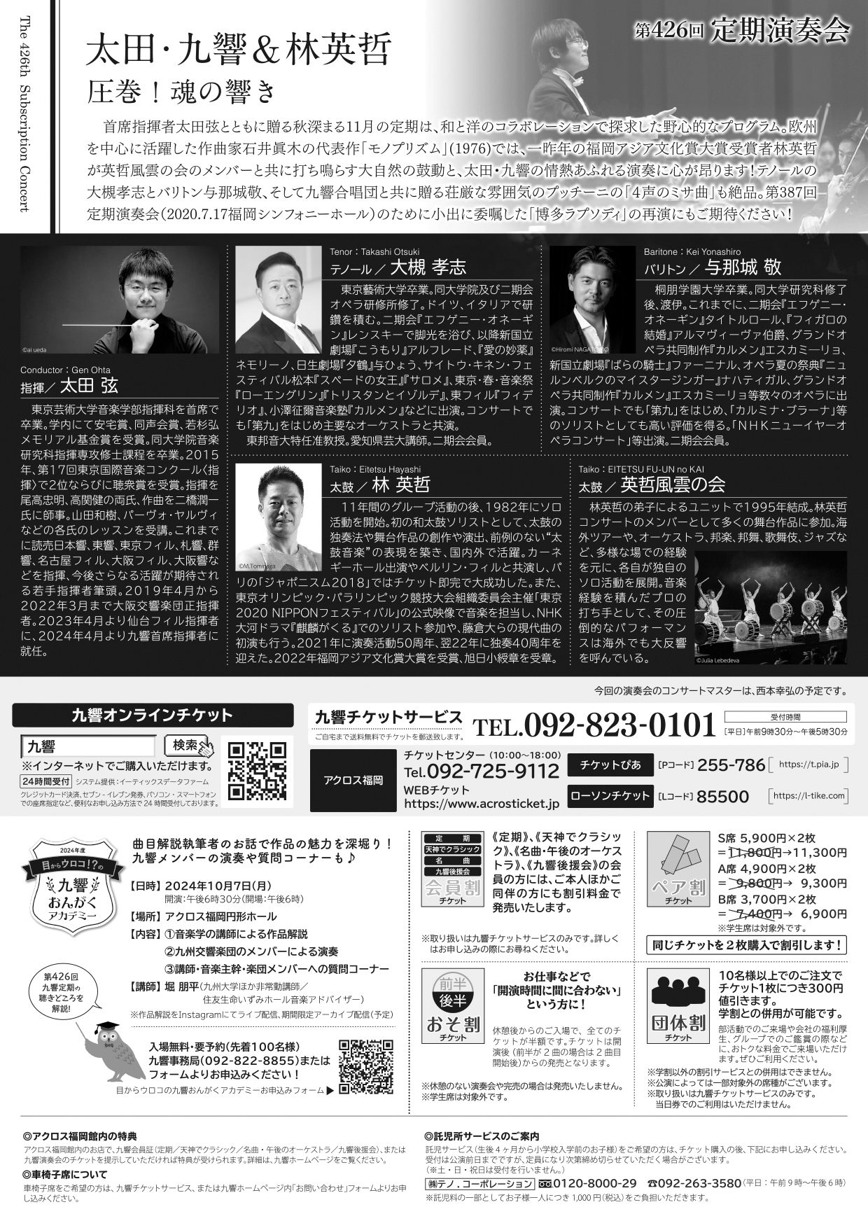 テノール 大槻 孝志 バリトン 与那城 敬 太鼓 林英哲と英哲風雲の会 合唱 九響合唱団・九州大学男声合唱団コールアカデミー 合唱指揮 横田諭 |