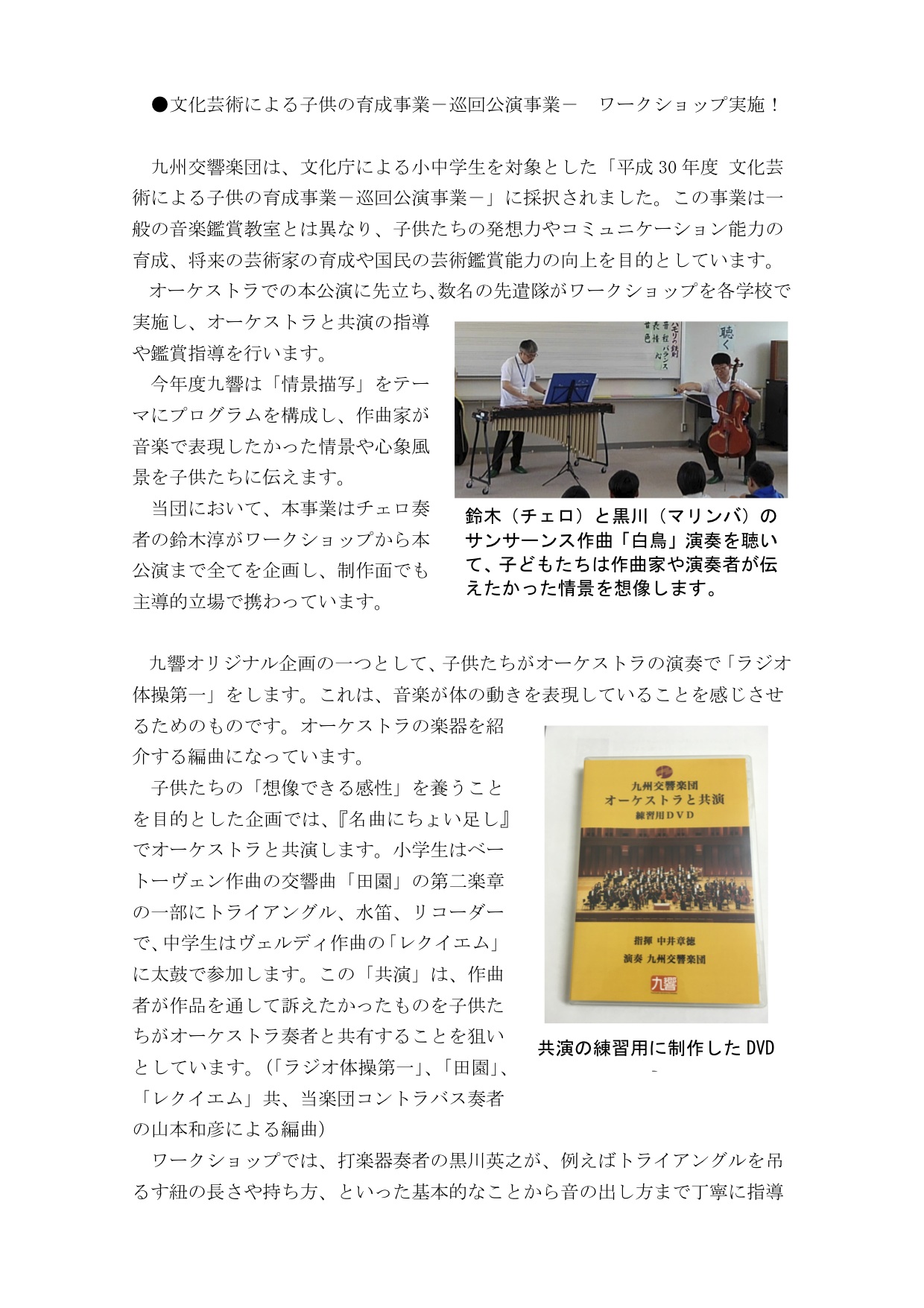九州交響楽団は、文化庁による小中学生を対象とした「平成30年度 文化芸術による子供の育成事業-巡回公演事業-」に採択されました。この事業は一般の音楽鑑賞教室とは異なり、子供たちの発想力やコミュニケーション能力の育成、将来の芸術家の育成や国民の芸術鑑賞能力の向上を目的としています。
