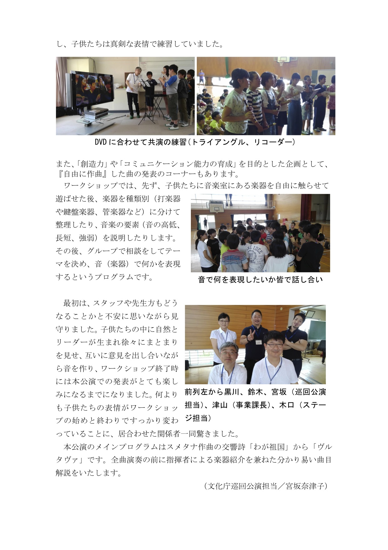 なお、 オーケストラでの巡回公演に先立ち、数名の先遣隊がワークショップを各学校で実施し、オーケストラと共演の指導や鑑賞指導を行いました。