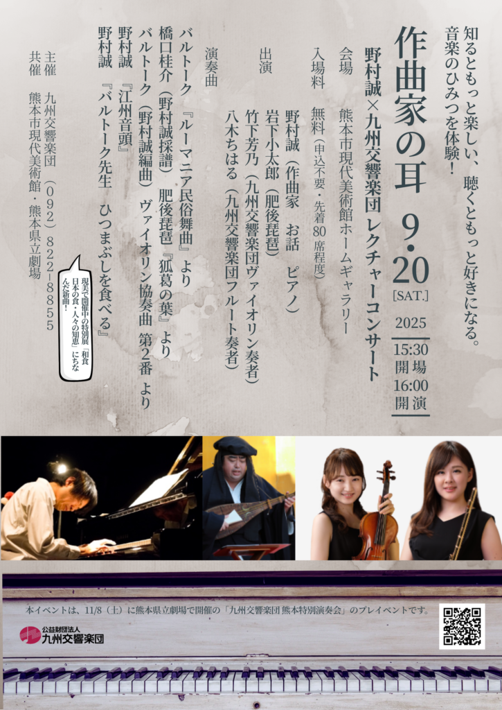熊本特別演奏会プレイベント「作曲家の耳 バルトークとストラヴィンスキー~野村誠×九州交響楽団 レクチャーコンサート~」