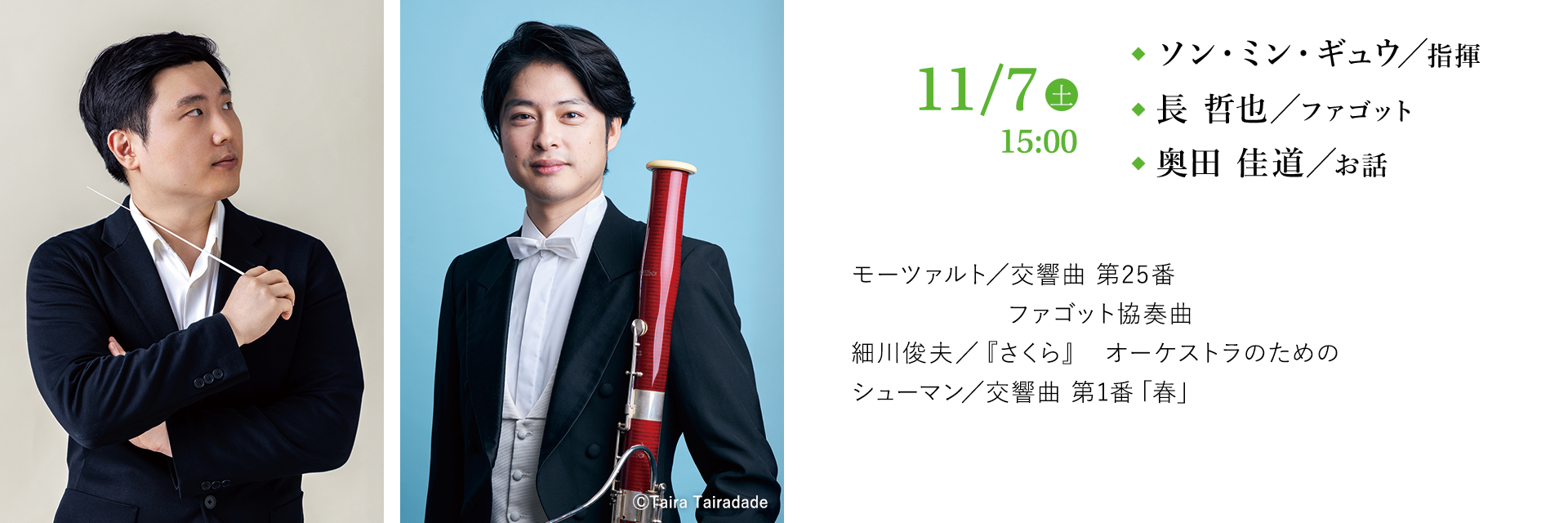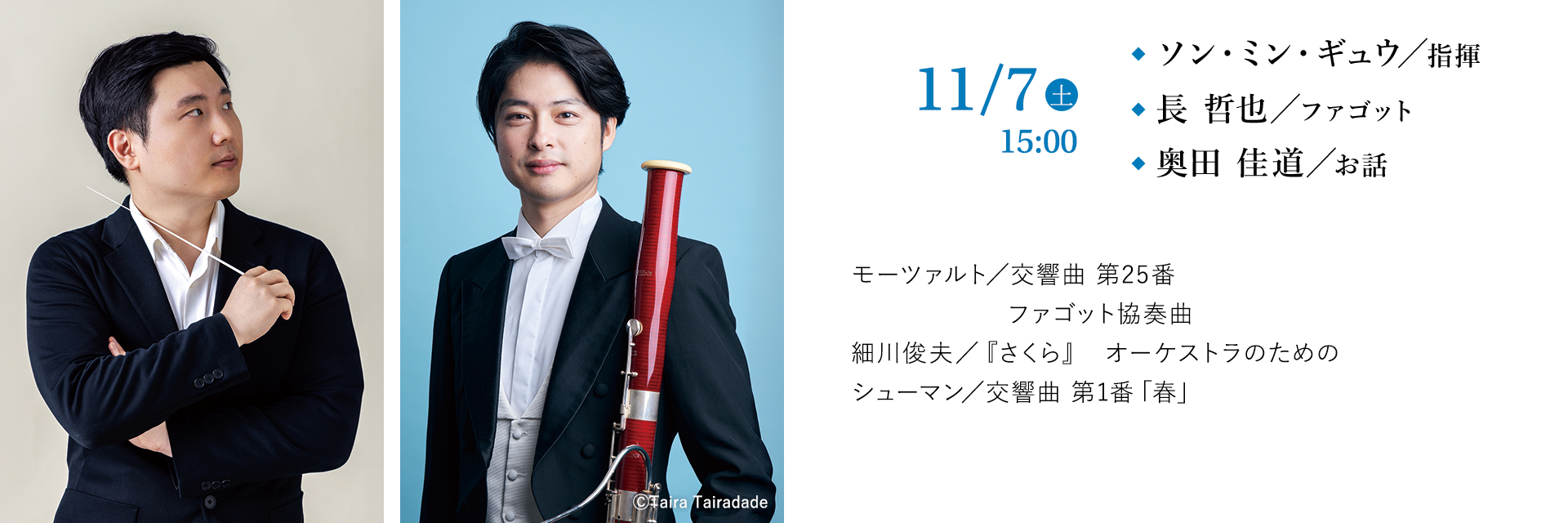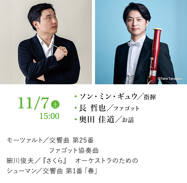 2024年、第2回広島国際指揮者コンクールでの2位入賞が記憶に新しい韓国の俊英、ソン・ミン・ギュウはその後、伊カンテルリ国際指揮者コンクールで優勝。九響へは初登場であるが、ベルリンでイサン・ユンに師事した細川の作品を置くことで全体に紐帯が生まれた美しいプログラムを持ってきてくれた。ファゴット独奏には北九州出身の名手、長哲也を迎える。