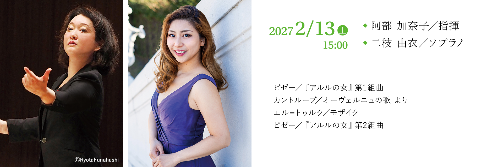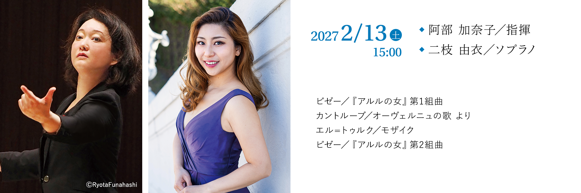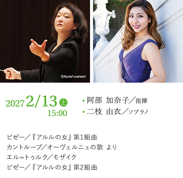 指揮者、作曲家である阿部加奈子はフランス、オーヴェルニュ地方のドーム交響楽団で音楽監督を務める。長崎出身でフランスで学んだ二枝由衣とともにオーヴェルニュの空気をそのままに歌を届けてくれるに違いない。欧州の歌劇場や音楽祭で次々と新作を発表するブシュラ・エル=トゥルク。阿部はその作品の多くの指揮を担っており、それがここで聴けるのも貴重な機会。