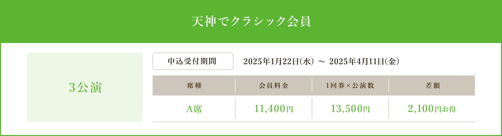 | A席 | 11,400円 | 13,500円 | 2,100円お得 |