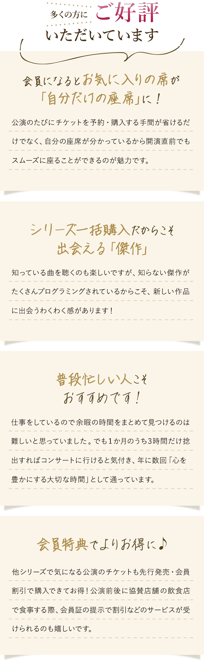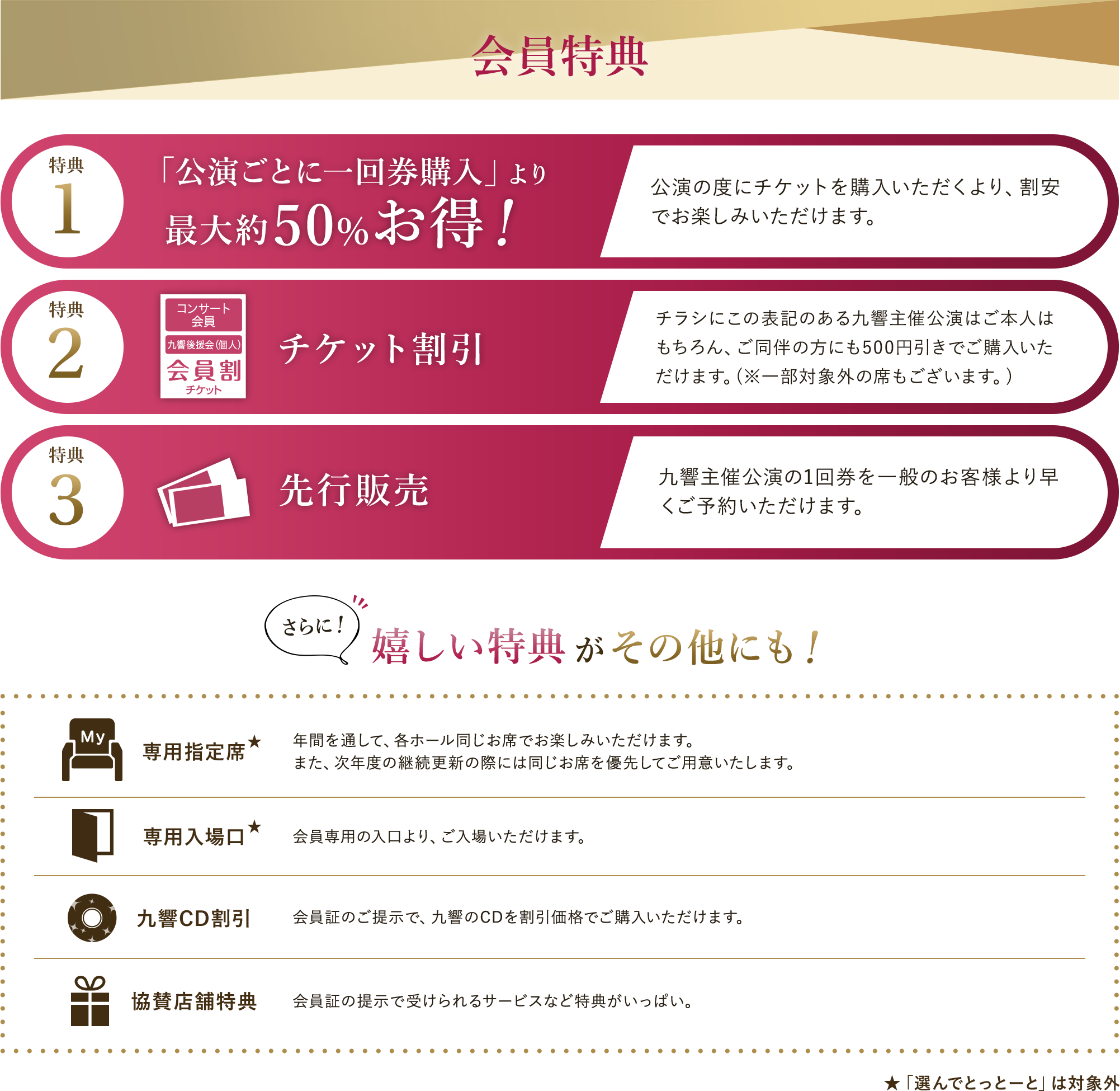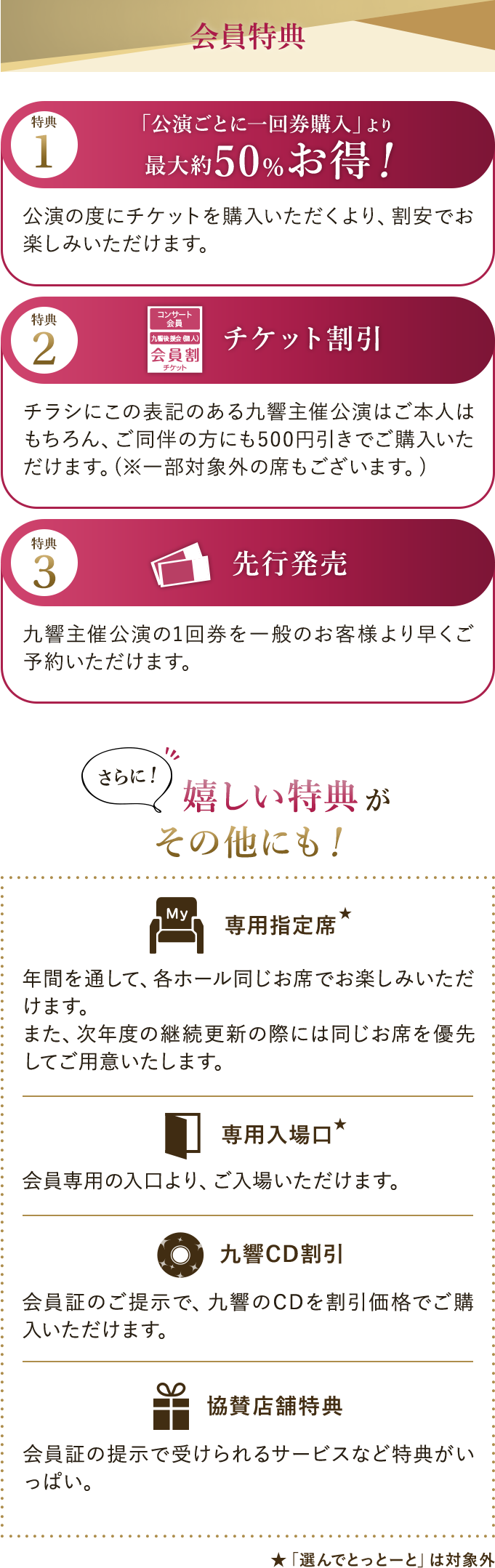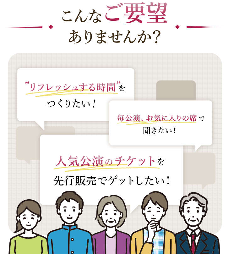 チケット料金が割引になるだけでなく、コンサート会員としての様々な特典も受けられるのでとってもお得です。