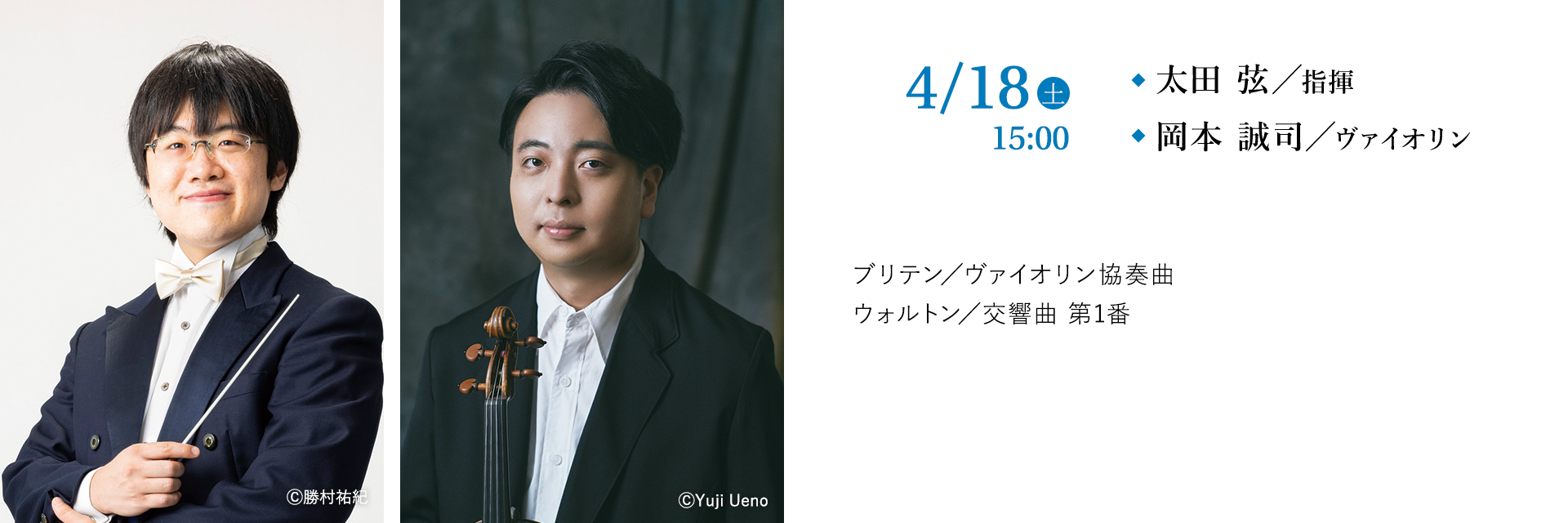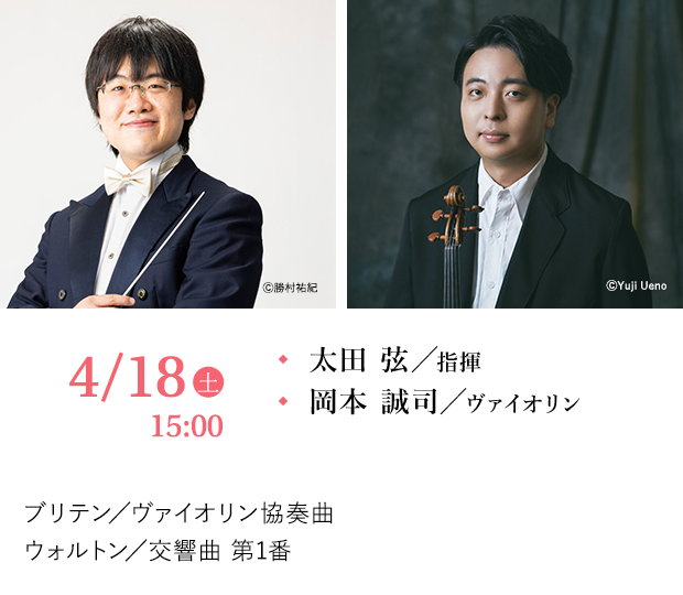 2026年シーズンは“満を持して”ウォルトンの交響曲で幕を開ける。太田弦のスペシャリティ、英国音楽のなかでも自家薬籠中と呼べる作曲家がウォルトンだ。途中作曲が行き詰まり完成していた3楽章までで一度初演。約1年後に待望の全曲初演を迎え大絶賛された作品。同じく英国のブリテンによるヴァイオリン協奏曲は同ジャンルの最高傑作であり、定期演奏会では初共演となる名手、岡本誠司がこちらも“満を持して”登場する。