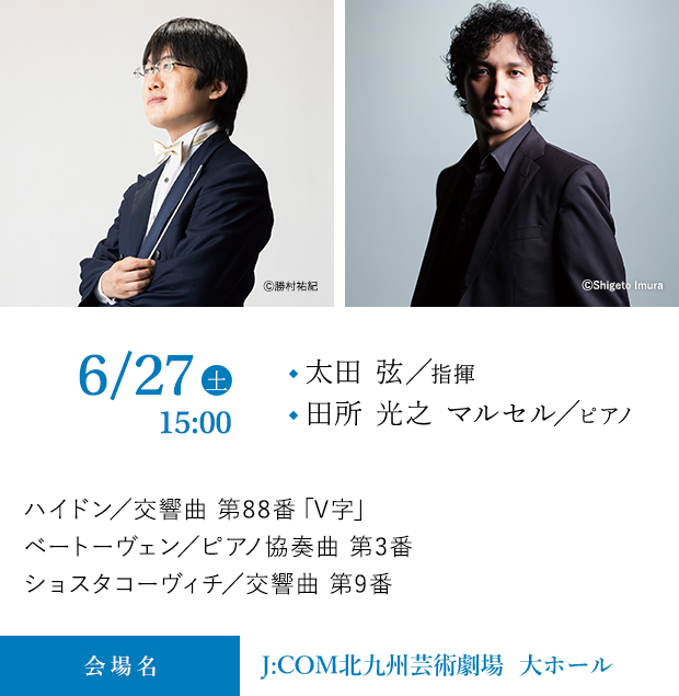 首席指揮者、太田弦が北九州定期に初登場。軽妙洒脱で古典音楽の極みのハイドンとそのエッセンスを20世紀に蘇らせたショスタコーヴィチの秀才、天才の組み合わせ。ハイドンで完成された古典派の更に先を切り拓いたベートーヴェンの協奏曲には、北九州国際音楽祭での好演も記憶に新しい田所光之マルセルを迎える。