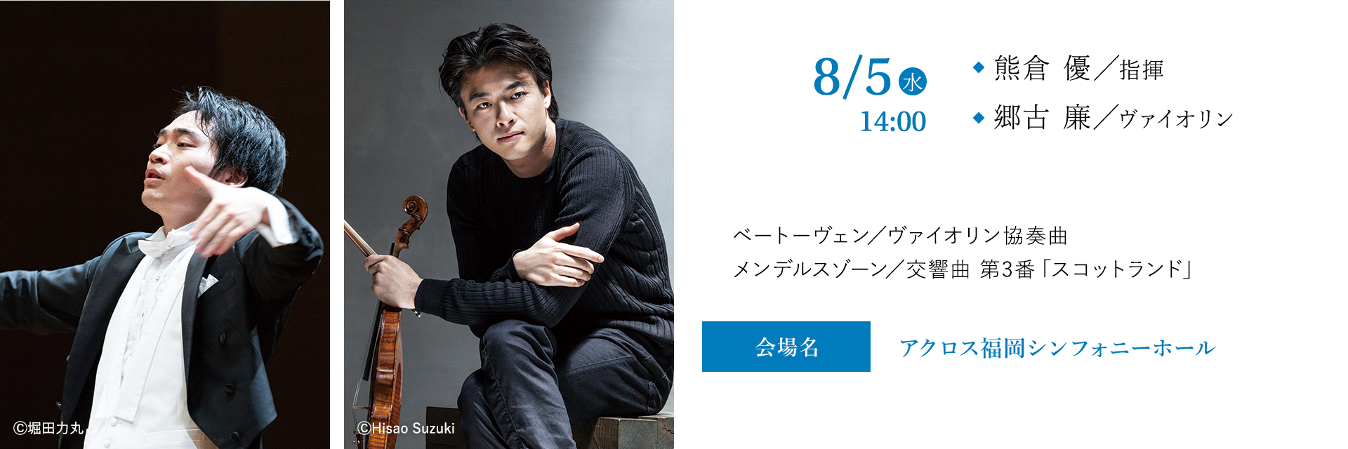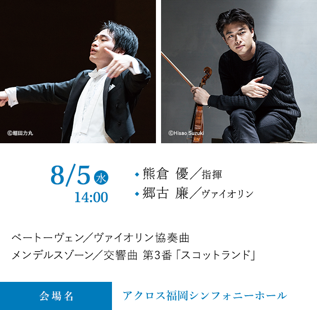 NHK交響楽団第1コンサートマスター、郷古廉を再び九響に迎える。王道のベートーヴェンの協奏曲で真っ向勝負。2025年の九響オペラ「トスカ」を大成功に導いた熊倉優とは旧知の仲だからこその真夏の熱いセッションに期待したい。
