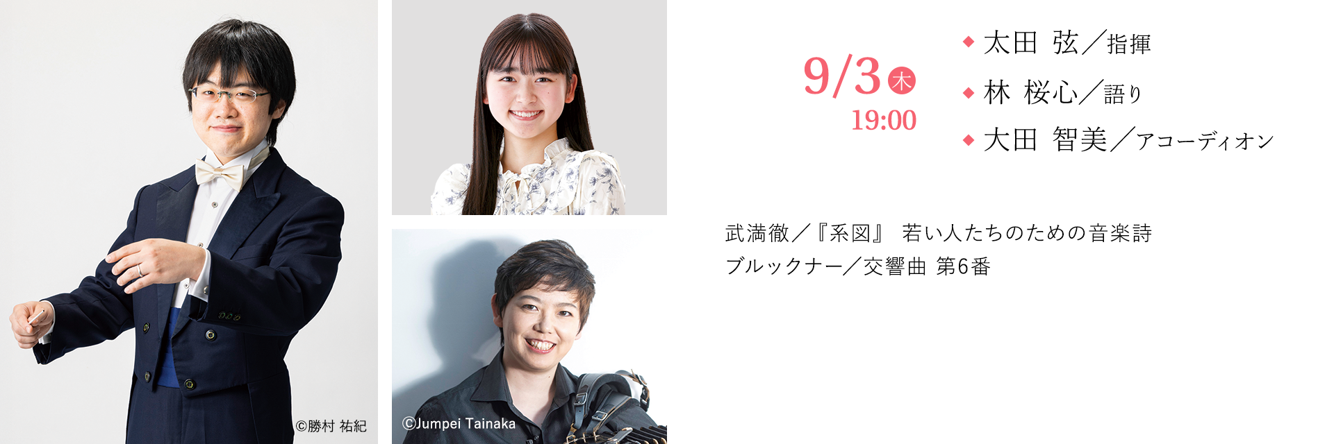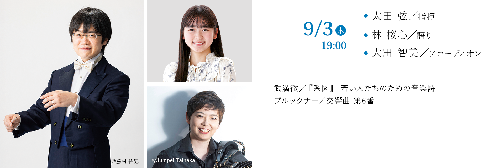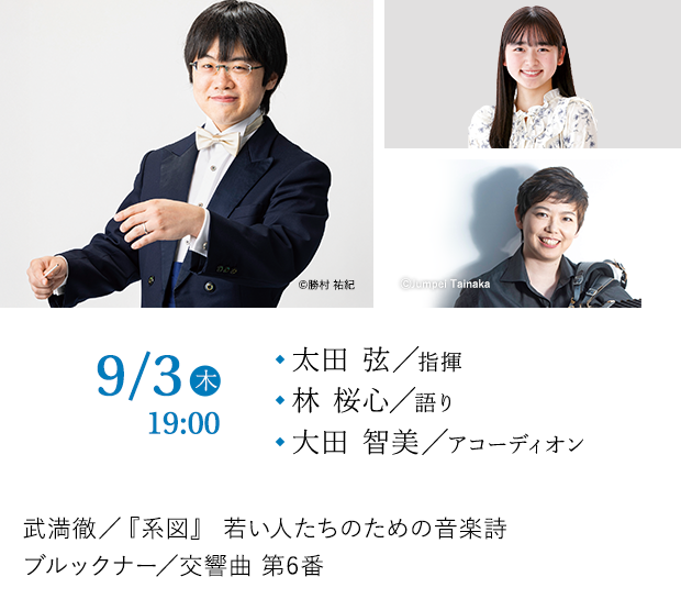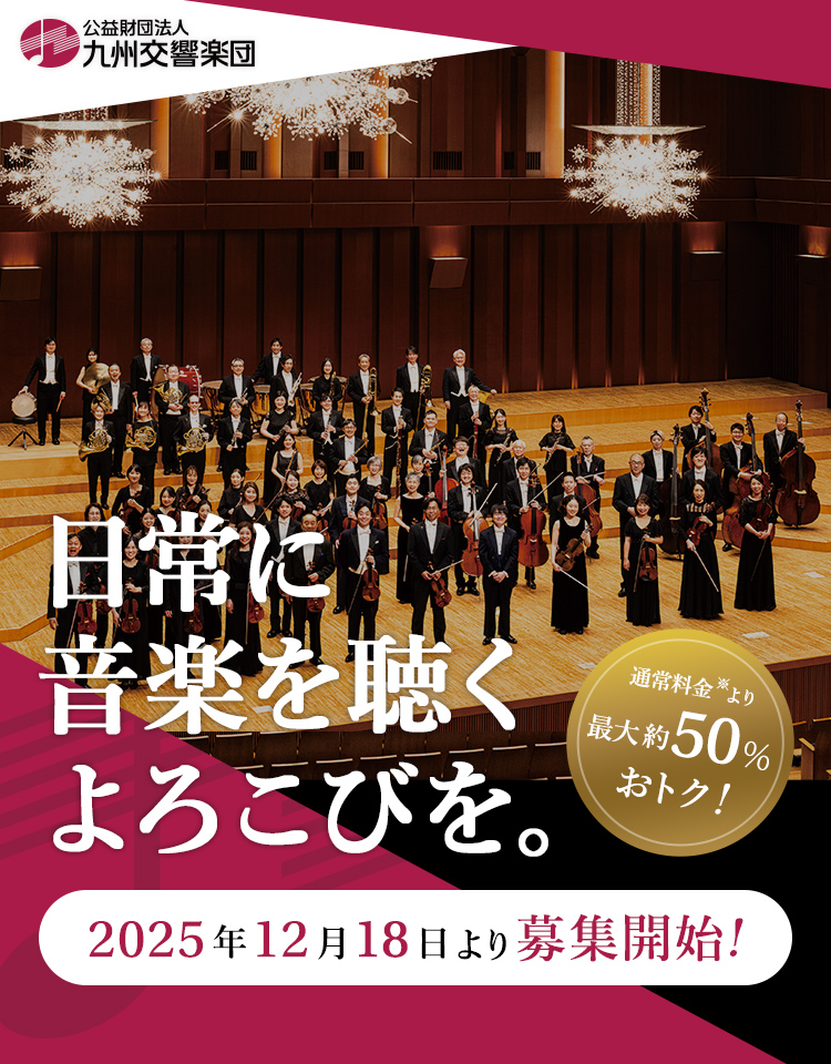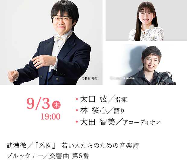 2026年は作曲家、武満徹の没後30年。“ひと昔”どころか一世代前になってしまった。その一世代前の昭和の薫りを感じつつも現代にも通じる家族というものを描く『系図』。「むかしむかし」と始まる少女の語りは福岡で活躍する林桜心が担う。さらに「むかしむかし」の作曲家、ブルックナーも没後130年の記念年である。九響との初めての交響曲をのびのびとした6番に選んだことに太田の個性とセンスを感じる。