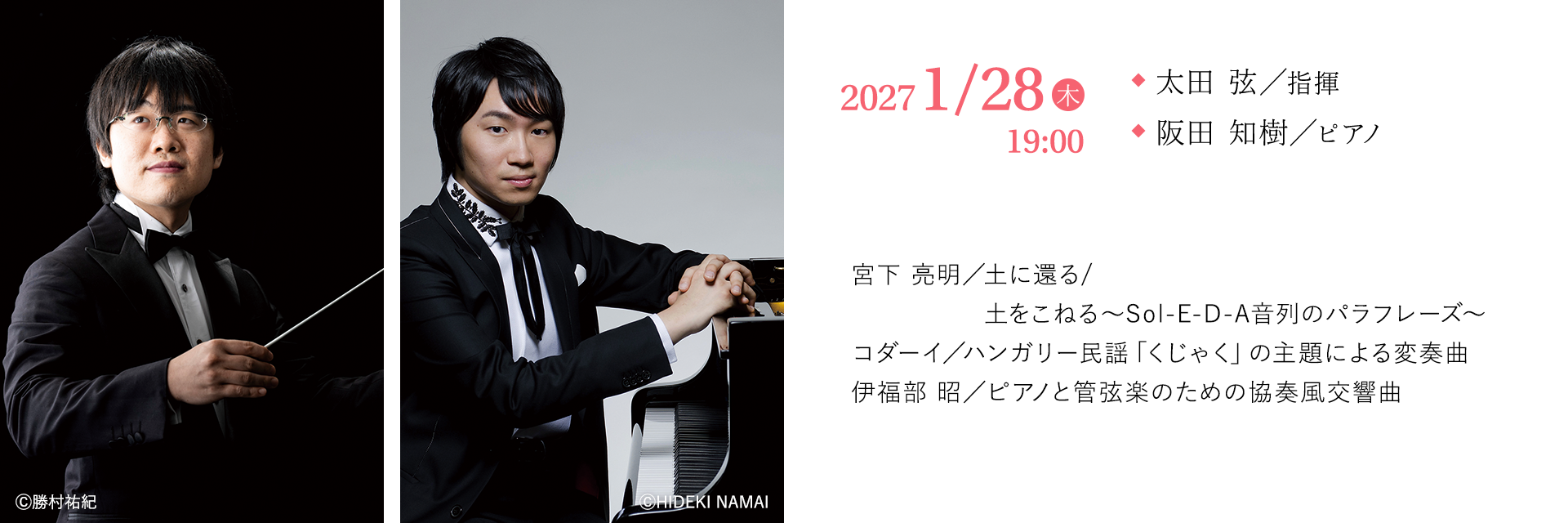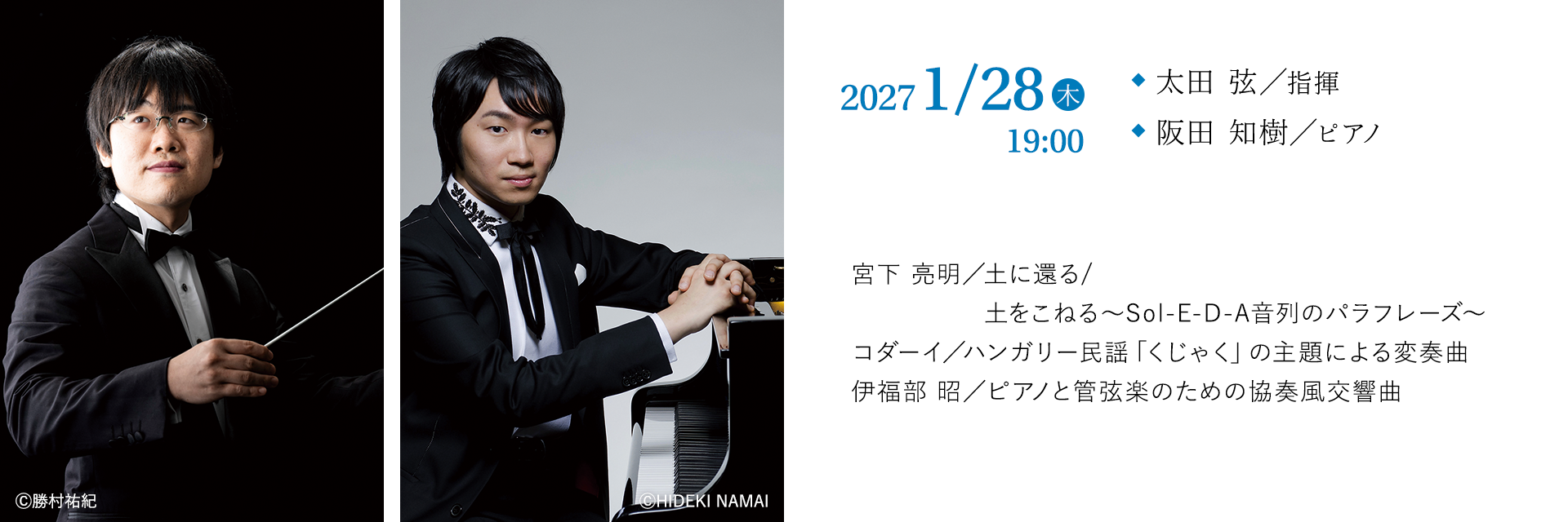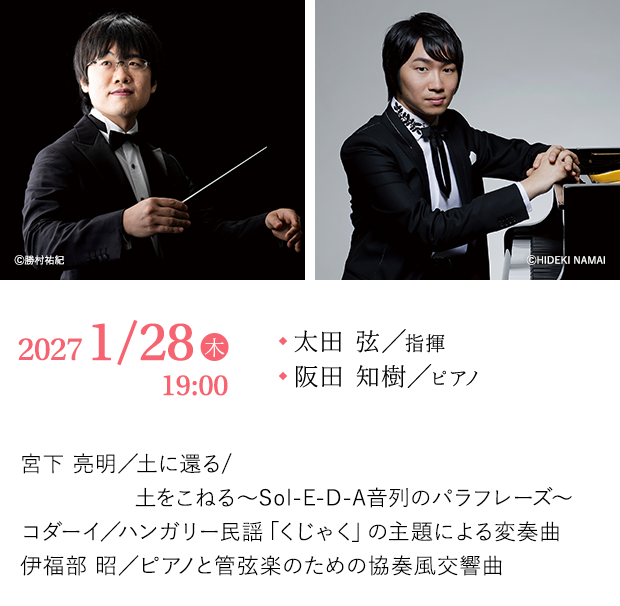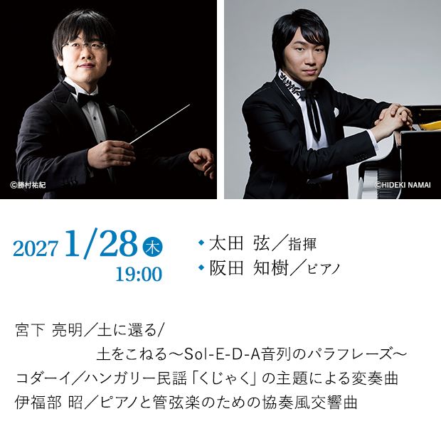 福岡県が中心となりJR日田彦山線沿線地域で進めるアーティスト・イン・レジデンス事業(作曲家が東峰村、添田町に滞在して地域住民と交流をしながら作曲を進める)で生まれた作品が初めてアクロス福岡で響き渡る。その邦人作曲家の系譜を遡るとぶつかる巨星、伊福部昭の出身は札幌西高校(旧制札幌第二中学)であり実は太田弦と同窓。またピアノの阪田知樹は作曲家でもあるが伊福部の孫弟子にあたる。これ以上ない組み合わせで採り上げる『協奏風交響曲』は先の大戦勃発から3か月後に初演された大作である。