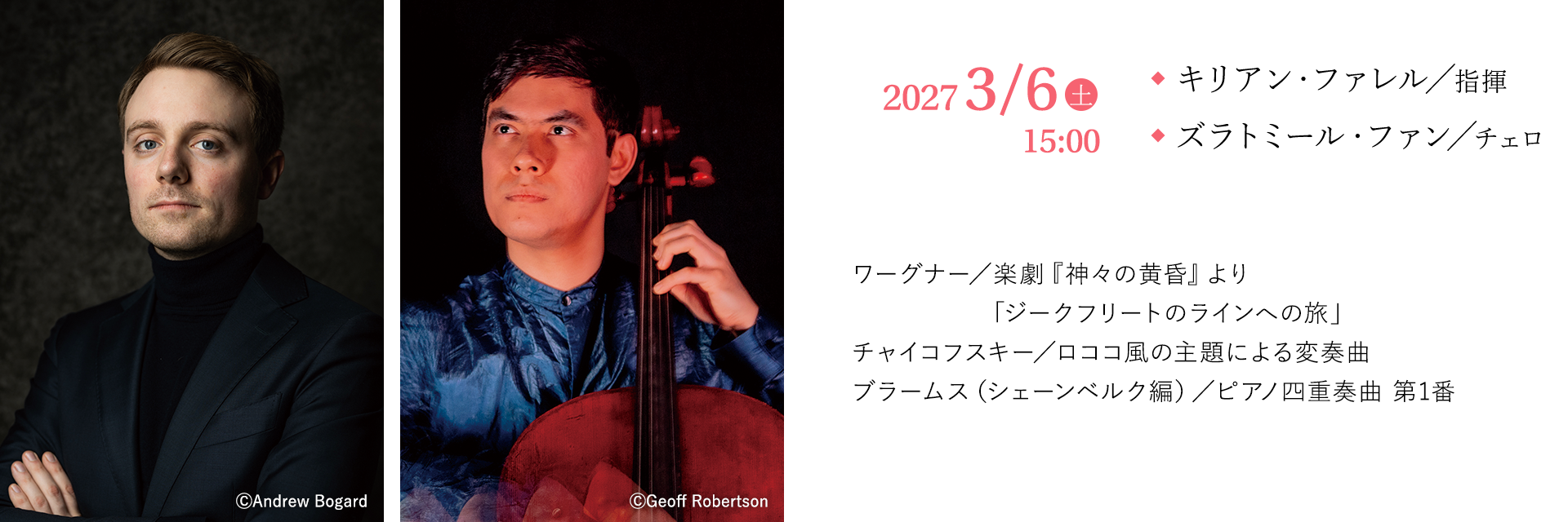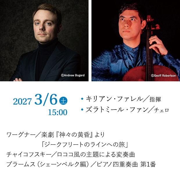 ワーグナーが創設したバイロイト音楽祭の第1回にはチャイコフスキーの姿があった。チャイコフスキーはワーグナーの音楽を称賛し影響も受けるのだが、一方でワーグナーを強く非難することも。ワーグナーのもう一人のライバル、ブラームスの室内楽作品をオーケストラに編み変えたのはシェーンベルク。本人が言うほどにはブラームスを尊重したとは思えない、全く別の魅力を引き出した編曲。この一筋縄ではいかない関係の4人の作曲家を指揮するのは、ブラームスが自身の第4交響曲を指揮、初演したマイニンゲンの楽団の現在のシェフ、キリアン・ファレルである。協力:日本音楽財団 特別協力:日本財団