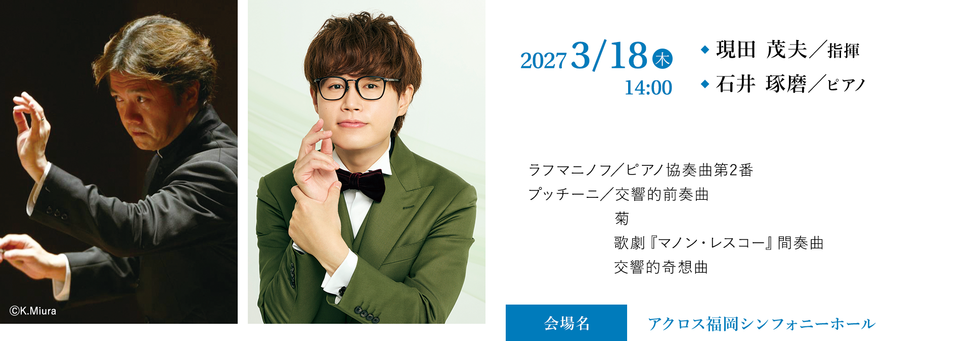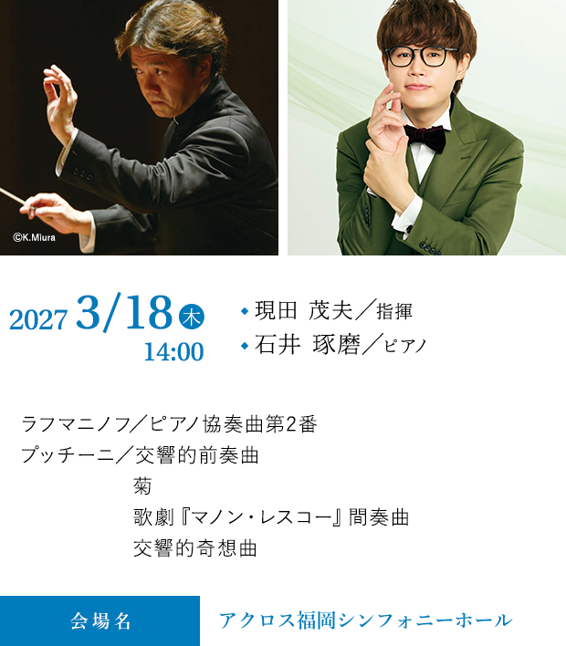 国内外でのリサイタル、オーケストラとの共演に加えて、”TAKU-音 TV たくおん”YouTubeチャンネルでの活動が、クラシック音楽ファンの地平を広げている、石井琢磨が得意曲を引っ提げて九響に初登場。指揮は数々のコンサートで観客を魅了してきた現田茂夫。プッチーニの管弦楽曲と共に、歌心に溢れたセッションになること間違いなし。