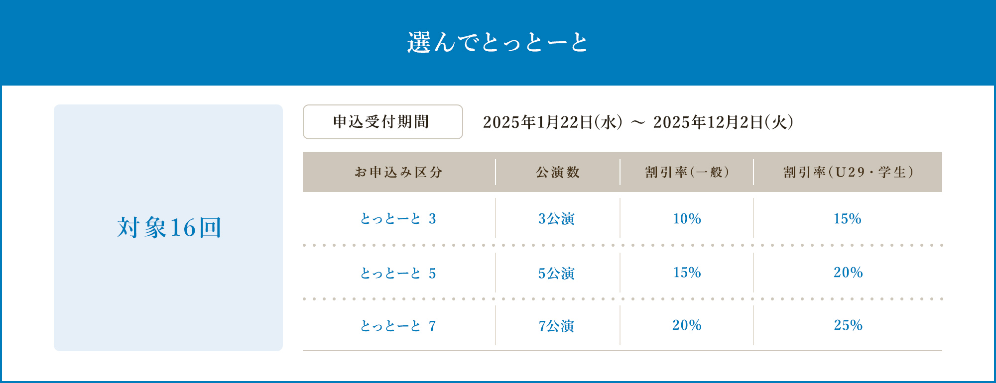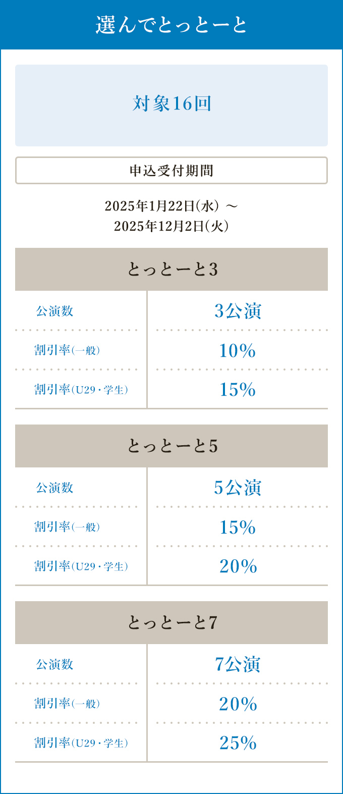 | お申込み区分 | 公演数 | 割引率(一般) | 割引率(U29・学生) |