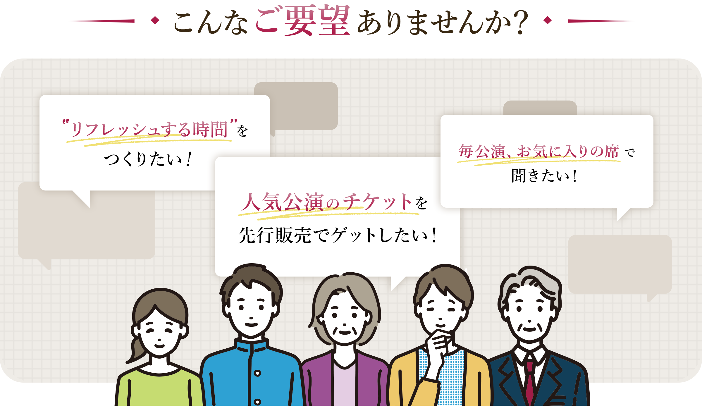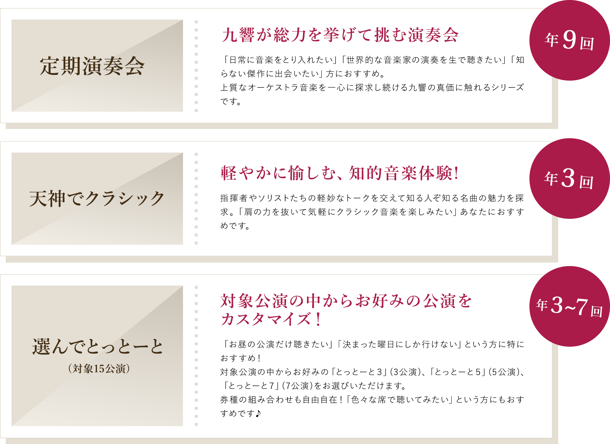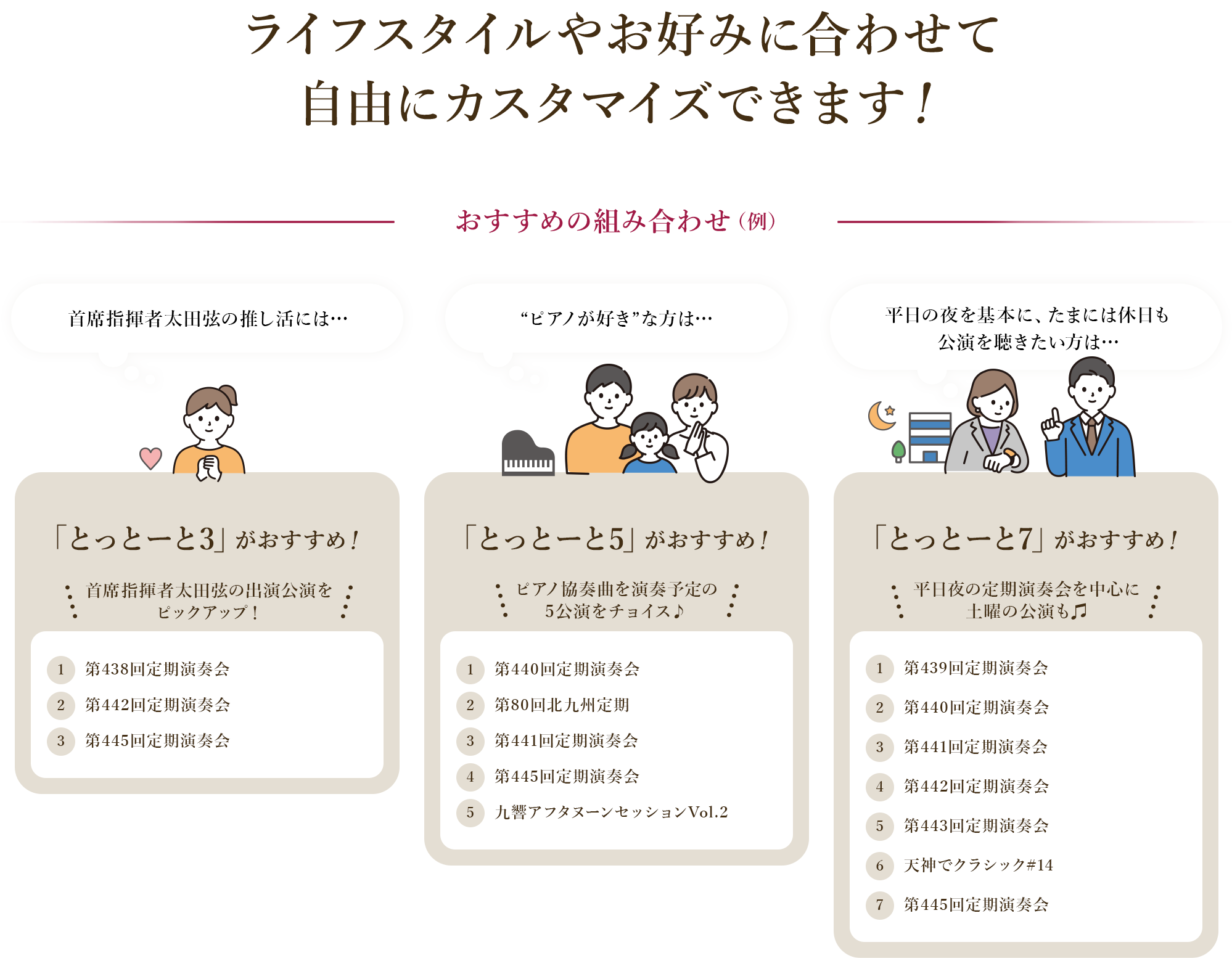 対象公演15公演の中から、3公演・5公演・7公演を自由な組み合わせで選んでいただけるカスタマイズ型の制度です。