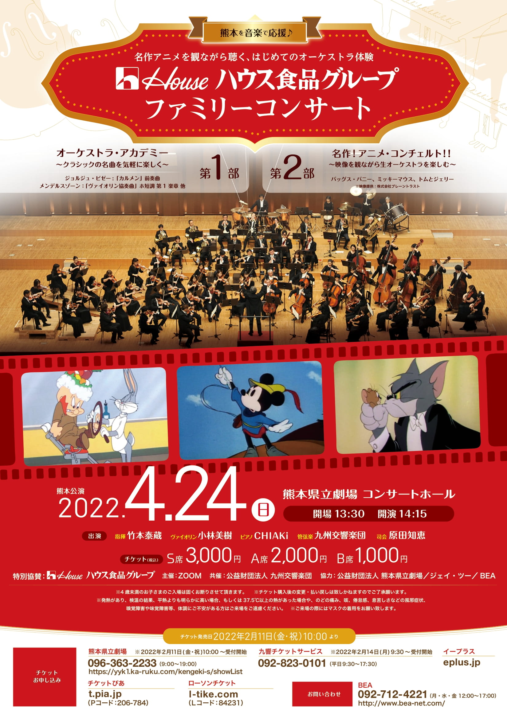 第1部 オーケストラ・アカデミー ~クラシックの名曲を気軽に楽しく~ ヨハネス・ブラームス/「ハンガリー舞曲」第5番 ルロイ・アンダーソン/「タイプライター」 ヴィットーリオ・モンティ/「チャールダーシュ」(ヴァイオリンソロ:小林美樹) フェリックス・メンデルスゾーン/「ヴァイオリン協奏曲」ホ短調 第1楽章 (ヴァイオリンソロ:小林美樹) ジョルジュ・ビゼー/「カルメン」前奏曲 第2部 名作!アニメ・コンチェルト!! ~映像を観ながら生オーケストラを楽しむ~ バッグス・バニー『セビリアのラビット理髪師』 「セビリアの理髪師」/ジョアキーノ・ロッシーニ ミッキーマウス『ミッキーの巨人退治』 「どろぼうかささぎ」序曲 他/ジョアキーノ・ロッシーニ 他 トムとジェリー『ピアノ・コンサート』 「ハンガリー狂詩曲第2番」/フランツ・リスト(ピアノソロ:CHIAKi) ※映像提供:株式会社ブレーントラスト ※本公演はウォルト・ディズニー社、ワーナー・ブラザース社とは一切関係ございません。 詳しくはこちらをご覧ください。 |