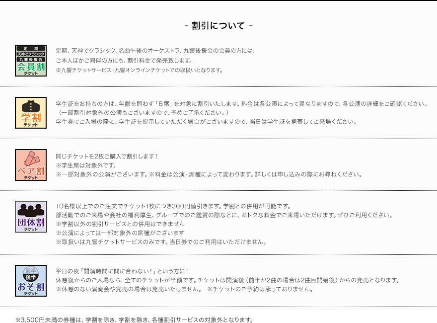 定期、天神でクラシック、名曲午後のオーケストラ、九響後援会の会員の方には、 ご本人ほかご同伴の方にも、割引料金で発売致します。 ※取扱いは、九響チケットサービスのみです。詳しくは、お申し込みの際にお尋ねください。 学生証をお持ちの方は、年齢を問わず「B席」を対象に割引いたします。料金は各公演によって異なりますので、各公演の詳細をご確認ください。 (一部割引対象外の公演もございますので、予めご了承ください。) 学生券でご入場の際に、学生証を提示していただく場合がございますので、当日は学生証を携帯してご来場ください。 同じチケットを2枚ご購入で割引します!定期演奏会:S席 5,200円2枚=10,400円>>>9,900円 A席4,200円2枚=8,400円>>>7,900円 B席3,100円2枚=6,200円>>>5,700円 名曲・午後のオーケストラ:S席 6,000円2枚=12,000円>>>11,500円 A席5,000円2枚=10,000 >>>9,500円 B席4,000円2枚=8,000円>>>7,500円 三大交響曲の夕べ:S席 5,500円2枚=11,000円>>>10,500円 A席4,500円2枚=9,000円>>>8,500円 B席3,500円2枚=7,000円>>>6,500円 ※天神でクラシックには、適用がありません。 お仕事などで「開演時間に間に合わない!」という方に!休憩後からのご入場なら、全てのチケットが半額です。チケットは開演後(前半が2曲の場合は2曲目開始後)からの発売となります。※休憩のない演奏会や完売の場合は発売いたしません。※チケットのご予約は承っておりません。※名曲・午後のオーケストラには、適用がありません。