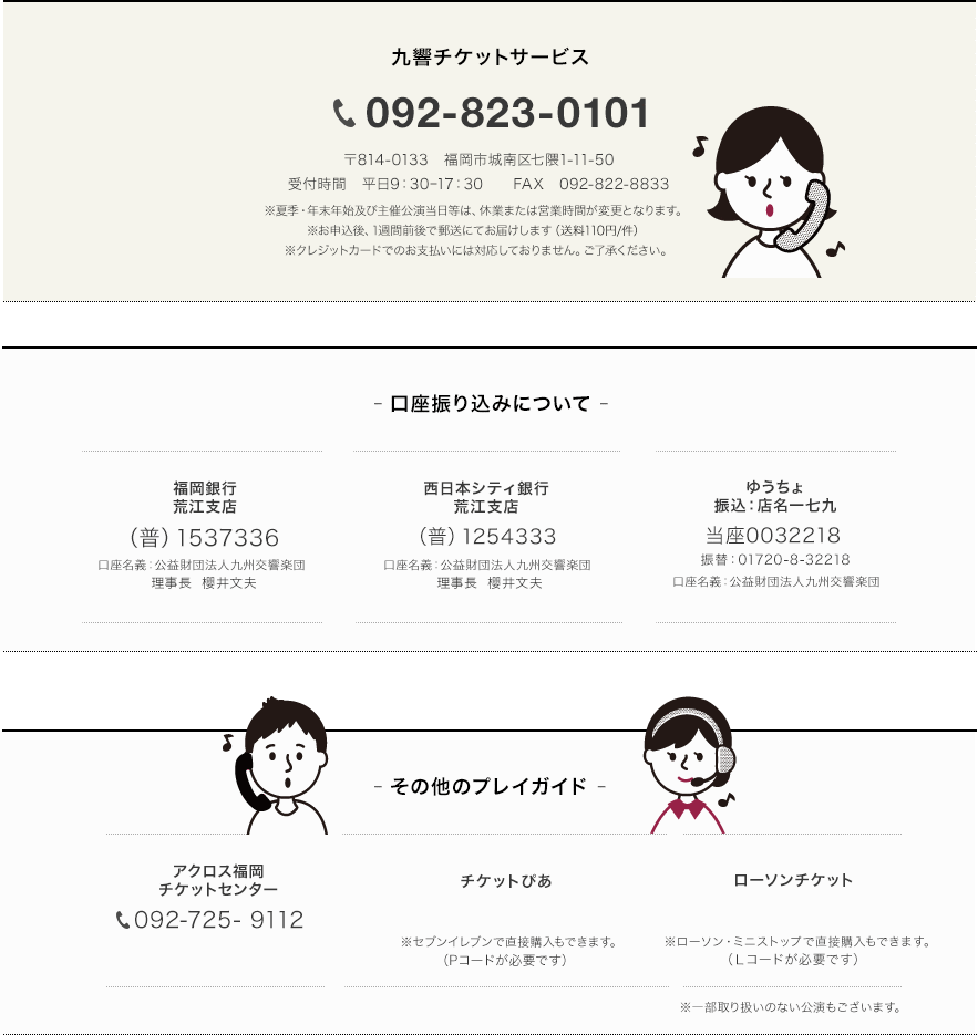092-823-0101 〒814-0133 福岡市城南区七隈1-11-50 受付時間 平日9:30ー17:30 FAX 092-822-8833 ※夏季・年末年始及び主催公演当日等は、休業または営業時間が変更となります。 ※お申込後、1週間前後で郵送にてお届けします(送料無料) ※クレジットカードでのお支払いには対応しておりません。ご了承ください。 ー その他のプレイガイド ー アクロス福岡 チケットセンター 092-725- 9112 チケットぴあ 0570-02-9999 ※セブンイレブン、サンクスで直接購入もできます。 (Pコードが必要です) ローソンチケット 0570-084-008 (Lコードが必要です) ※一部取り扱いのない公演もございます。
